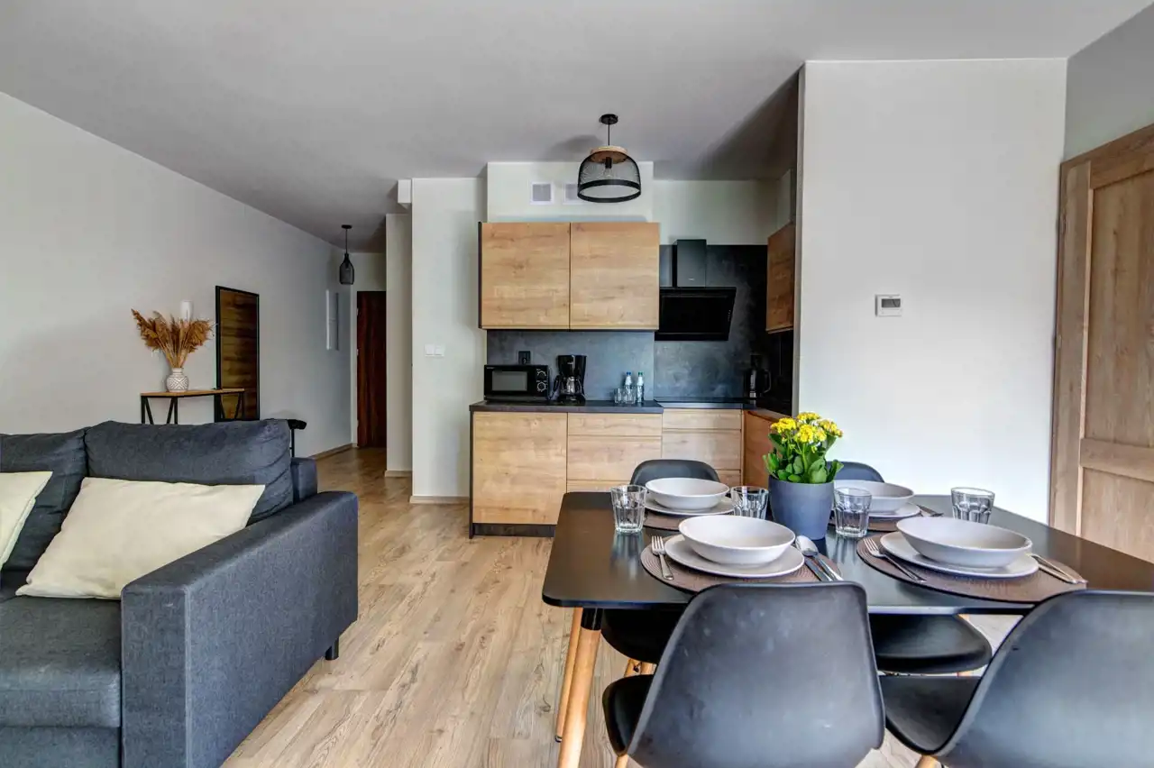 Apartament składa się z dwóch pokoi sypialnych, salonu z aneksem kuchennym i jadalnią i wyjściem na duży balkon z wystawą południową oraz przedpokoju, łazienki z wanną i WC. Pełne umeblowanie w wysokim standardzie, które pozostaje dla nowego właściciela, zapewnia komfortowy pobyt dla mieszkańców lub gości.