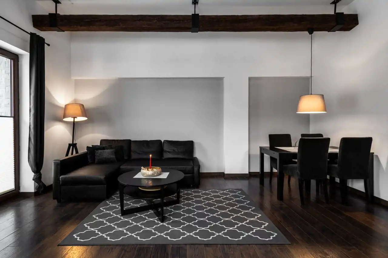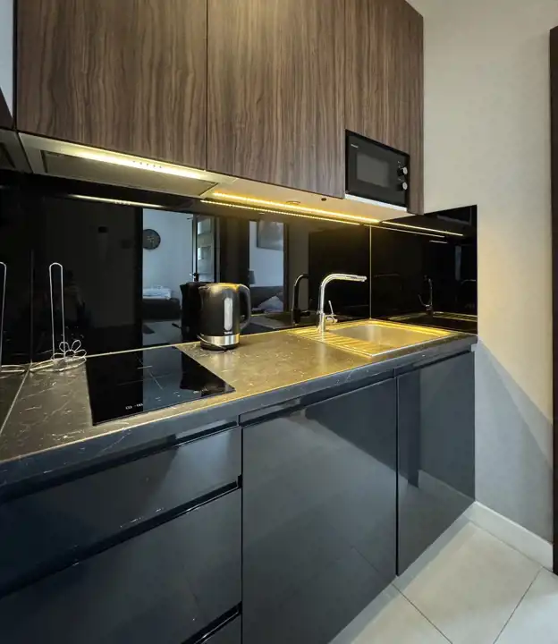 Składa się z sypialni, salonu, aneksu kuchennego oraz łazienki z kabiną prysznicową i pralką. Aneks kuchenny jest wyposażony w płytę indukcyjną, kuchenkę mikrofalową, lodówkę, czajnik elektryczny, zastawę stołowa, garnki i przybory kuchenne.