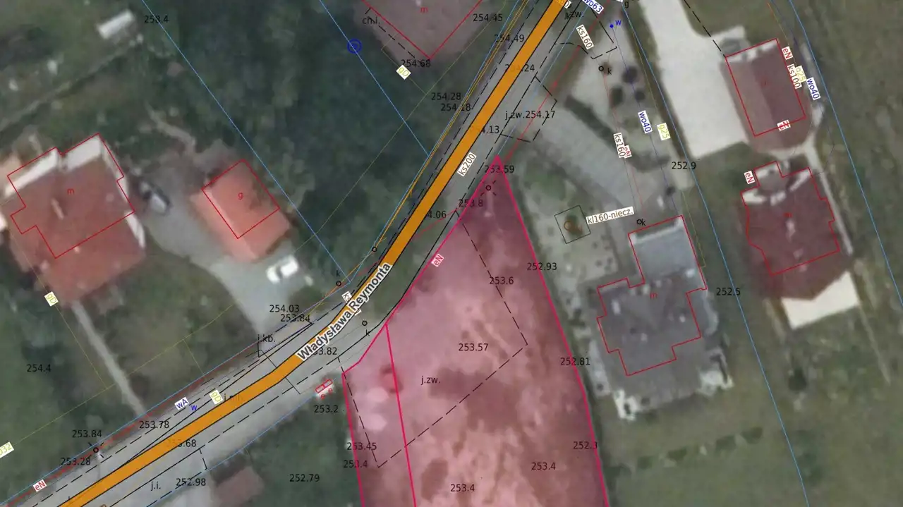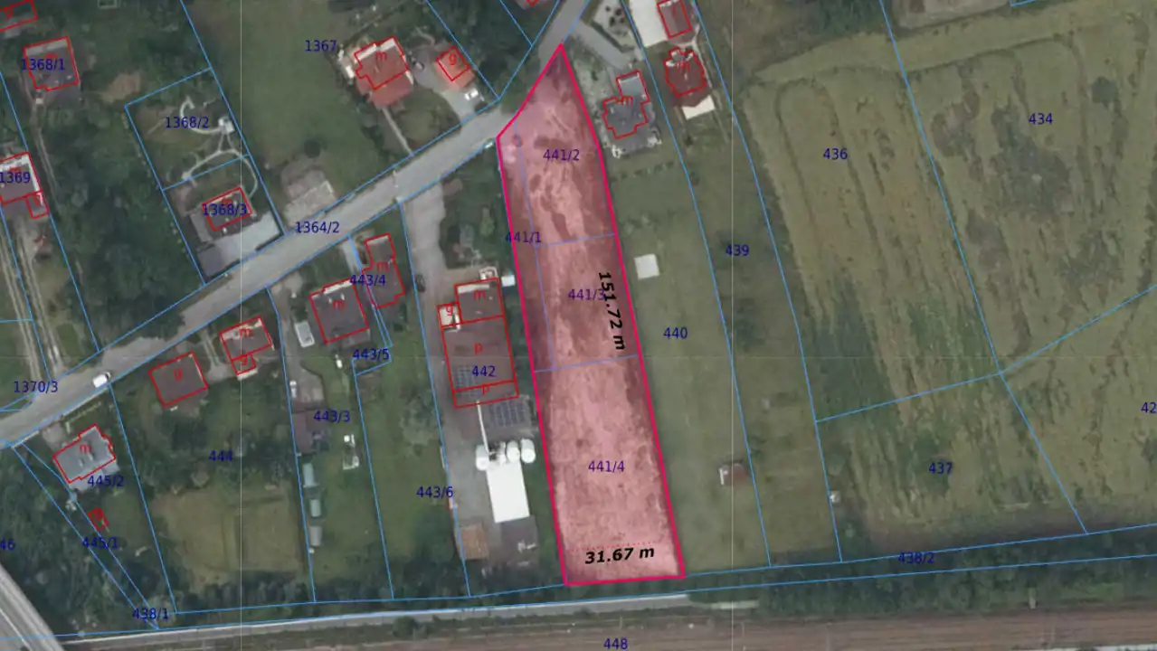 Nieruchomość składa się z 4 działek ewidencyjnych objętych jedną księgą wieczystą. Trzy działki ewidencyjne położone w północnej części nieruchomości znajdują się w terenie o przeznaczeniu pod zabudowę jednorodzinną MN1.1 i posiadają odpowiednio powierzchnię: 944 m2, 796 m2 i 406 m2 (działka wydzielona do komunikacji wewnętrznej - drogowa). Czwarta działka jest położona w południowej części nieruchomości, ma powierzchnię 1890 m2 i znajduje się na terenach rolnych, jednak jest objęta prawomocnym pozwoleniem na budowę dwóch budynków jednorodzinnych dwulokalowych.