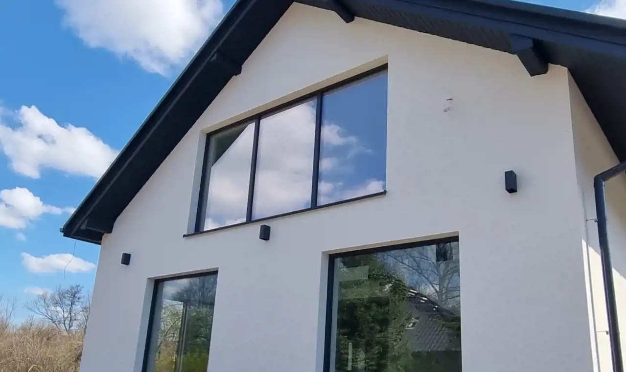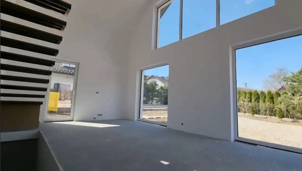 Dom wyróżnia się nowoczesną bryłą oraz dużymi przeszkleniami, które zapewniają doskonałe doświetlenie wnętrz. Centralnym punktem jest spektakularny salon o powierzchni 36,63 m² i ponadstandardowej wysokości, tworzący reprezentacyjną strefę dzienną z efektownym otwarciem na antresolę.
