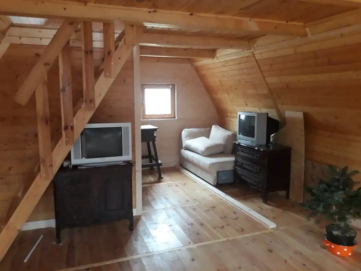 Działka ślicznie położna, dom drewniany, o powierzchni (35 m2 na dole ok 22 m2 na górze) ale nie skończony – brak doprowadzonej do domu wody i kanalizacji, nie ma jeszcze szamba na działce .
