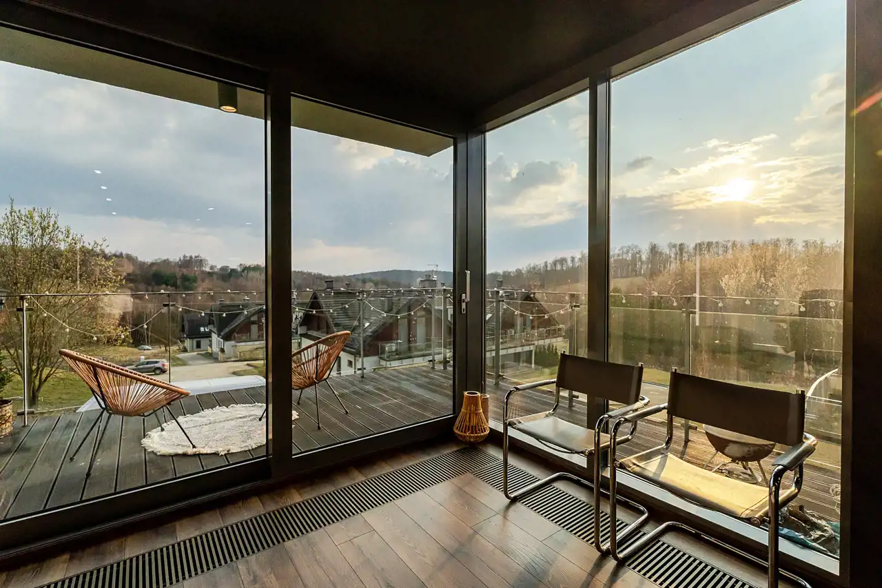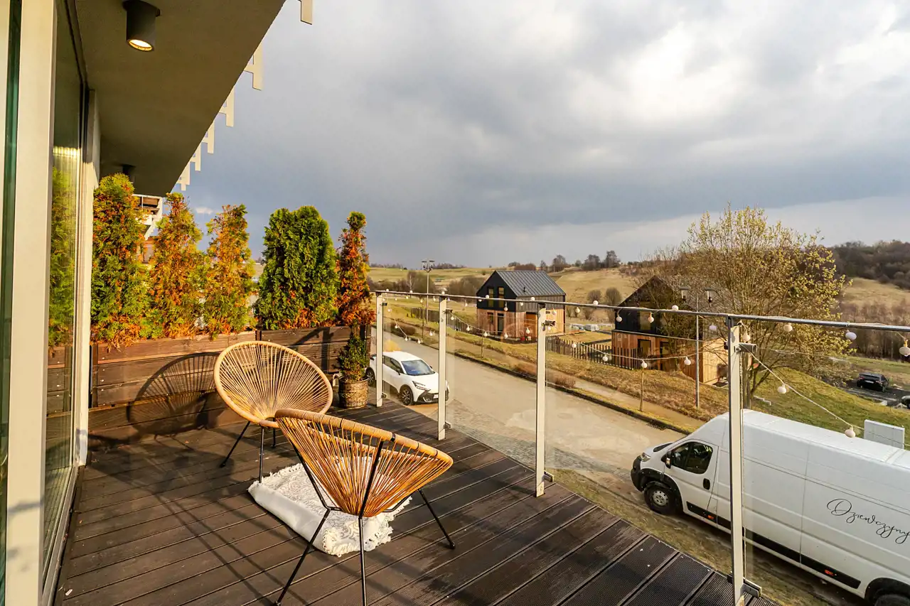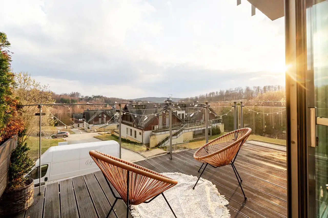 duży taras z ekspozycją południową i panoramicznym widokiem na tereny zielone, pole golfowe oraz lasy