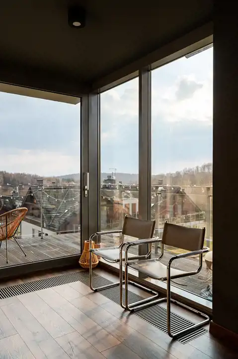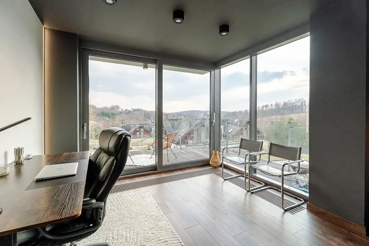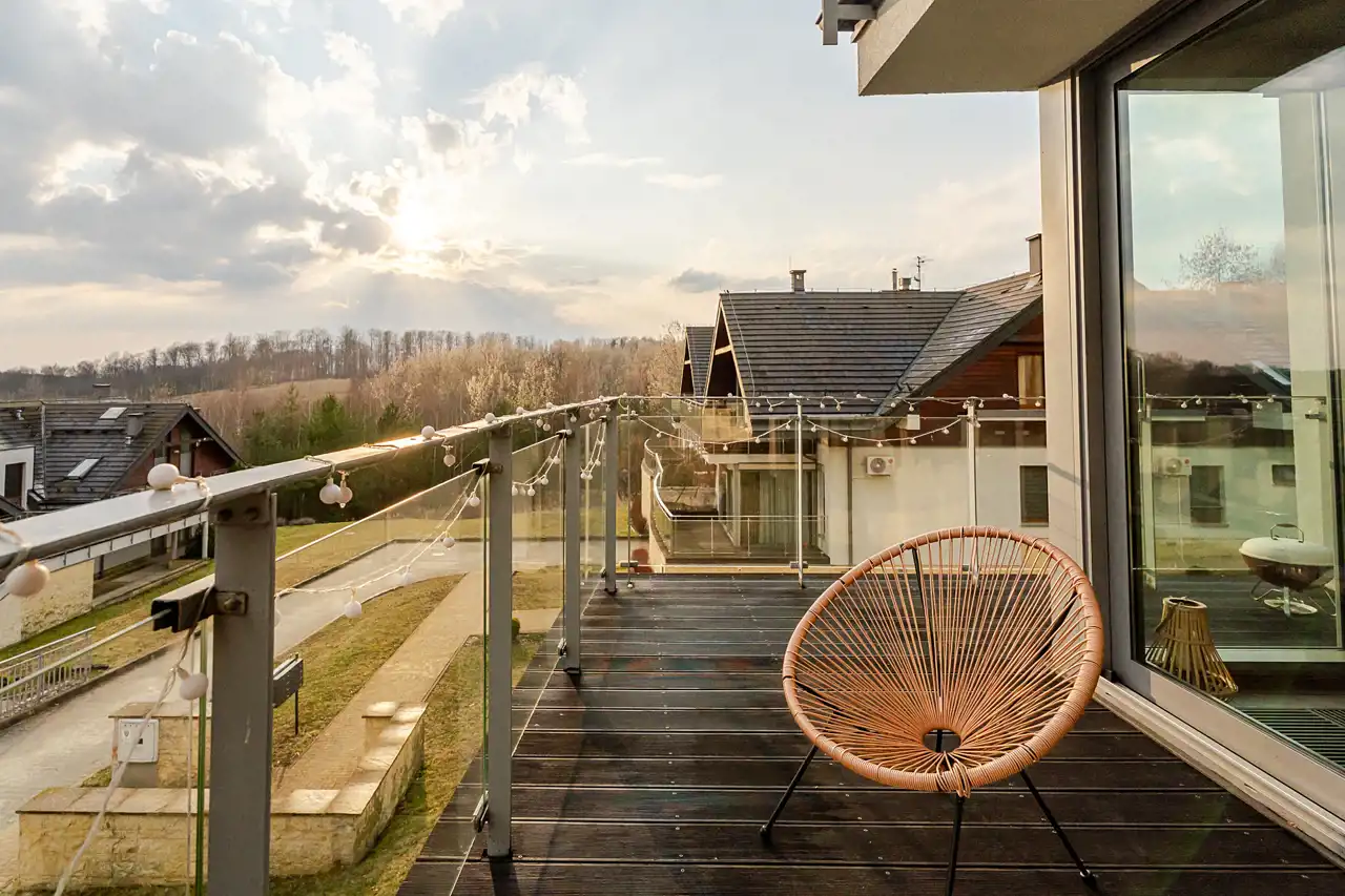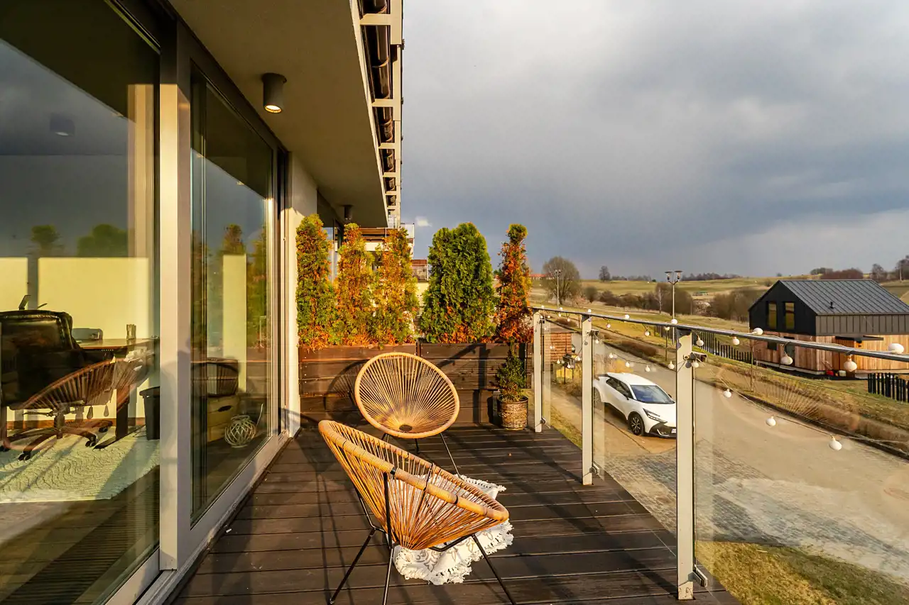 duży taras z ekspozycją południową i panoramicznym widokiem na tereny zielone, pole golfowe oraz lasy