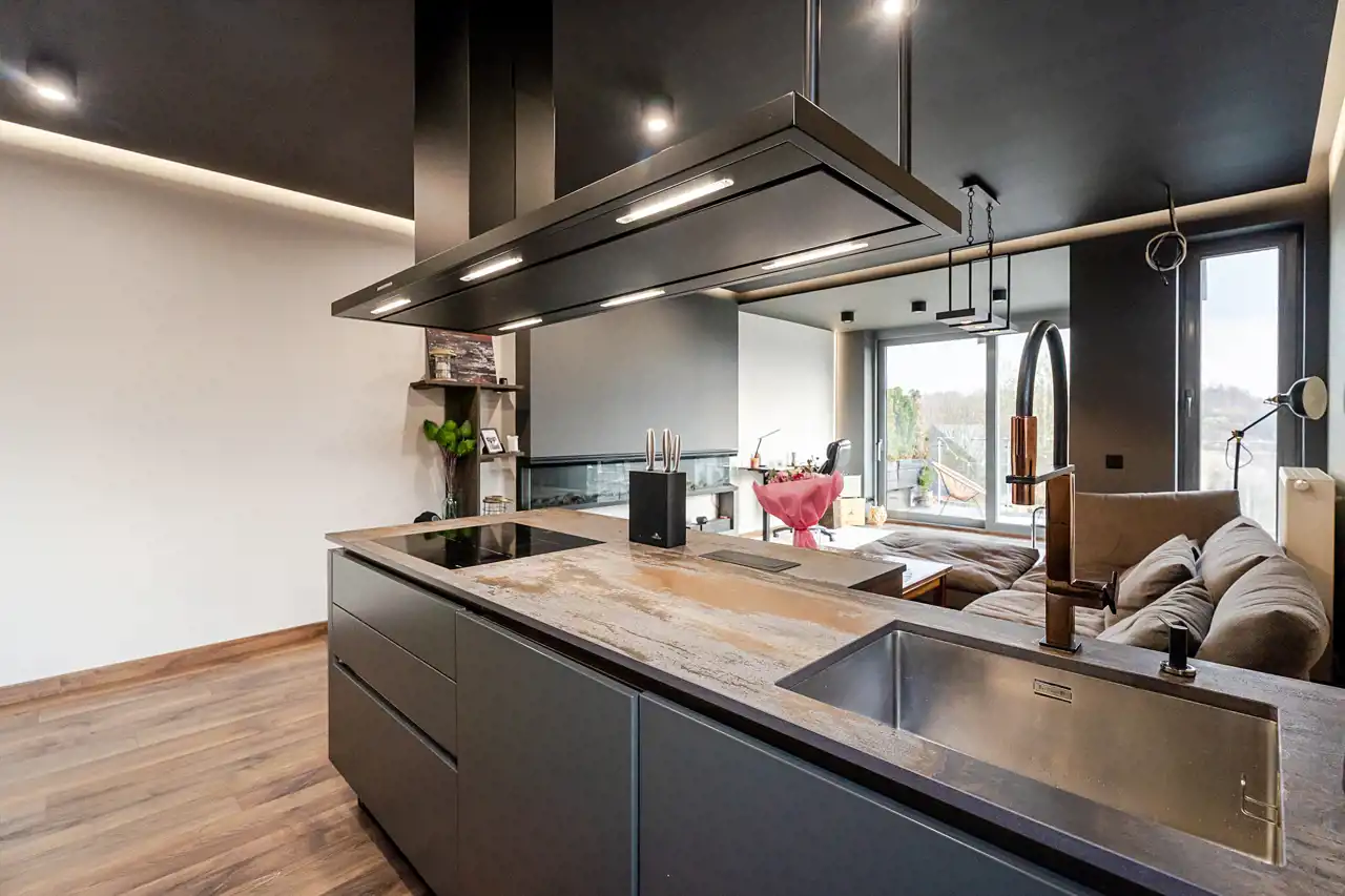 salon z otwartą kuchnią z wyspą