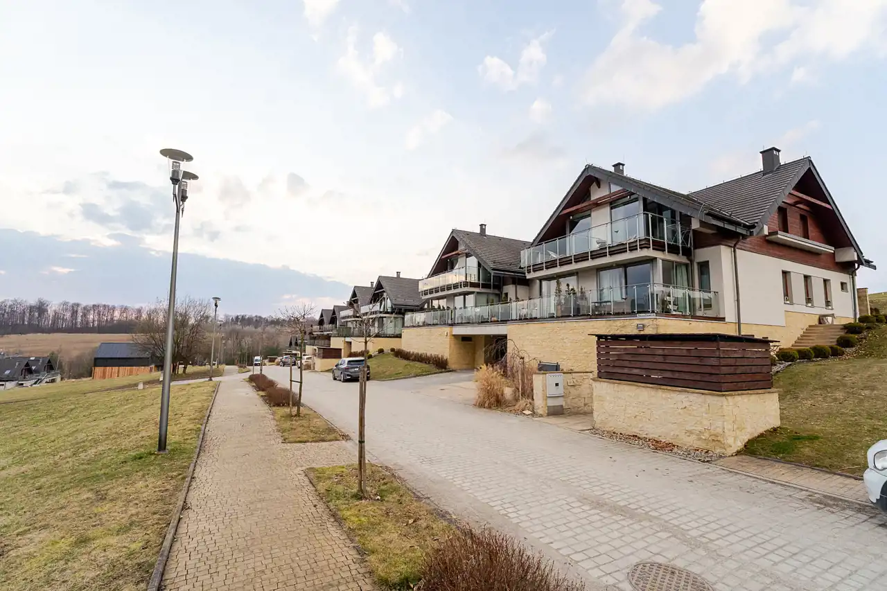 Spokojna i zielona okolica z dostępem do terenów rekreacyjnych i pola golfowego, co gwarantuje wyjątkowy klimat do życia.