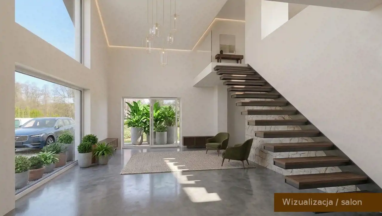 Dom wyróżnia się unikalną architekturą i spektakularnymi, wielkoformatowymi przeszkleniami, które zapewniają doskonałe doświetlenie. Centralnym punktem jest reprezentacyjny salon z ponadstandardową wysokością i efektownym otwarciem na antresolę. To przestrzeń i światło, jakich trudno szukać w typowych projektach.