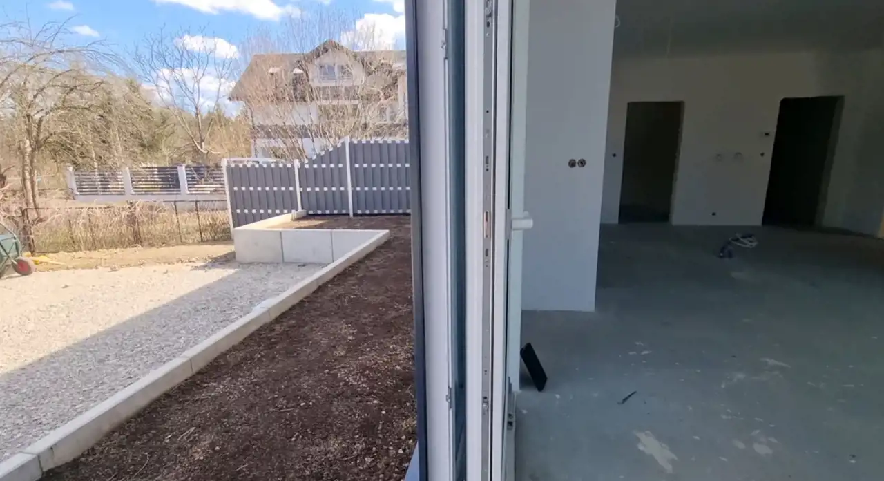 Stolarka: Okna PCV trzyszybowe z marmurowymi parapetami, drzwi zewnętrzne stalowe.
