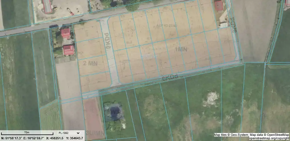 Średnia powierzchnia pojedynczej działki to ok. 860 m², a typowe wymiary to około 18 × 48 m.