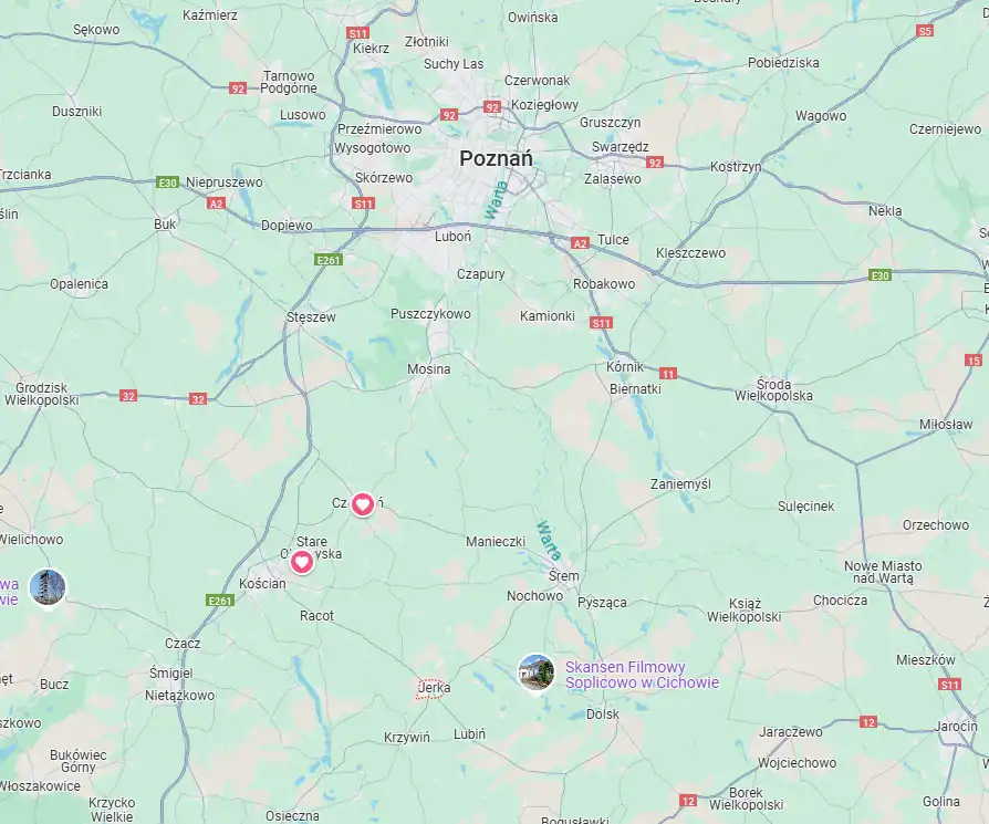 - Do Poznania – około 60 km (wygodny dojazd do stolicy Wielkopolski).
