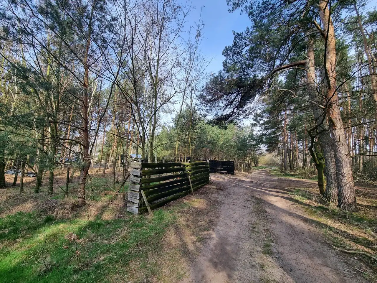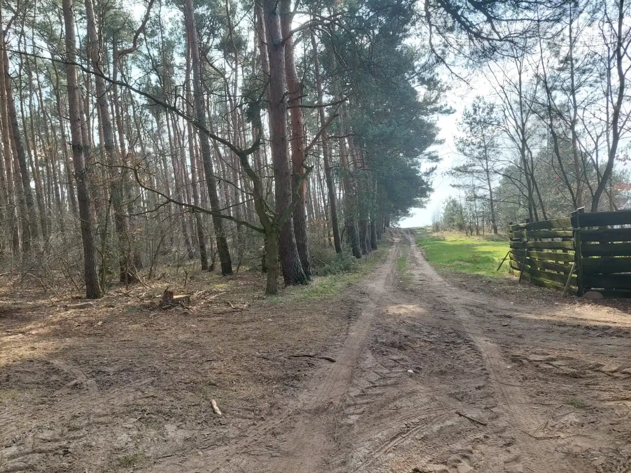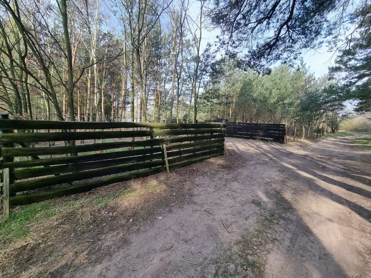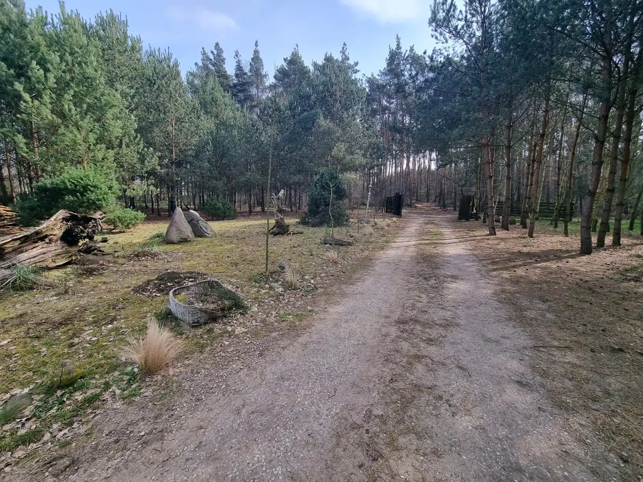 Teren częściowo zalesiony, działka ogrodzona płotem z siatki i bramą wjazdową drewnianą.