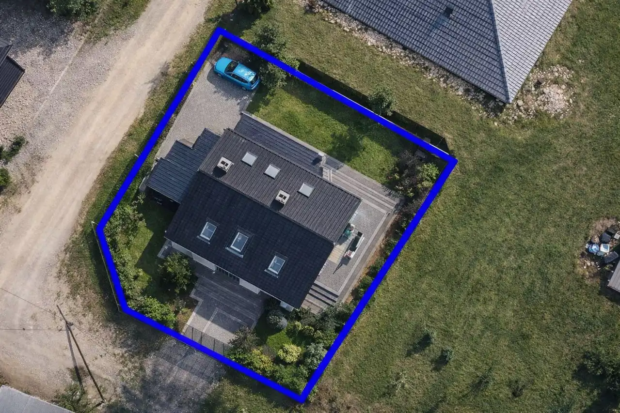 Sam dom, wybudowany w 2019 roku, ma 130 m² powierzchni użytkowej i został zaprojektowany w sposób, który sprawnie oddziela strefę dzienną/ gościnną od prywatnej. Salon z wyjściem na taras , który naturalnie łączy wnętrze z ogrodem.