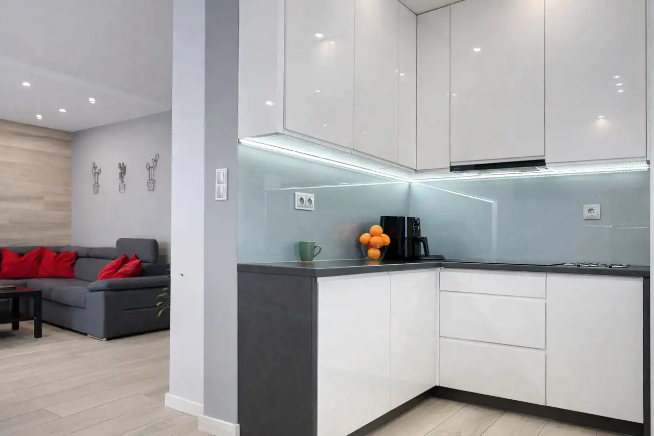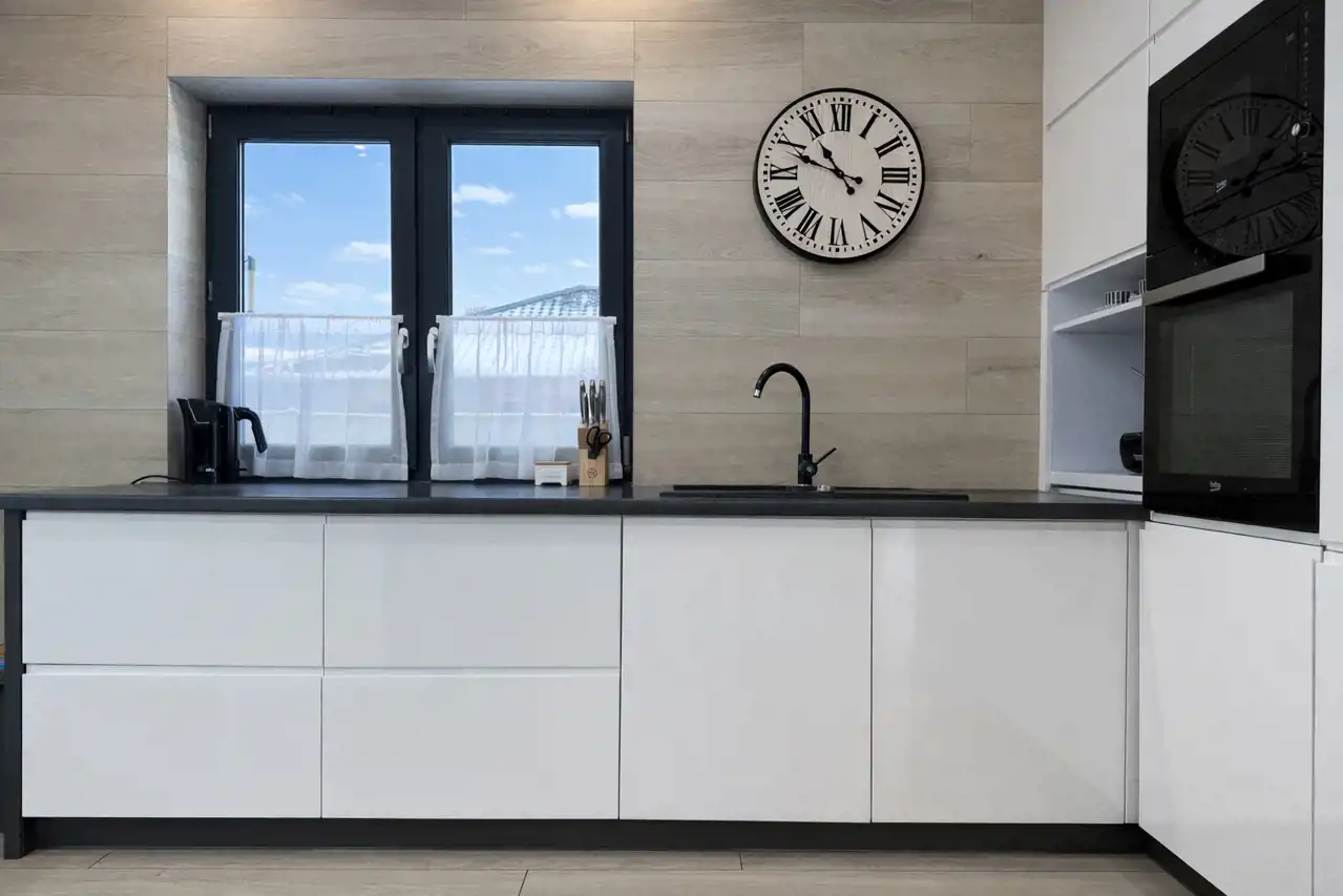 Kuchnia, ze spiżarnią która jest lekko osłoniętym aneksem kuchennym, dzięki czemu pozostaje spójna z częścią dzienną.
