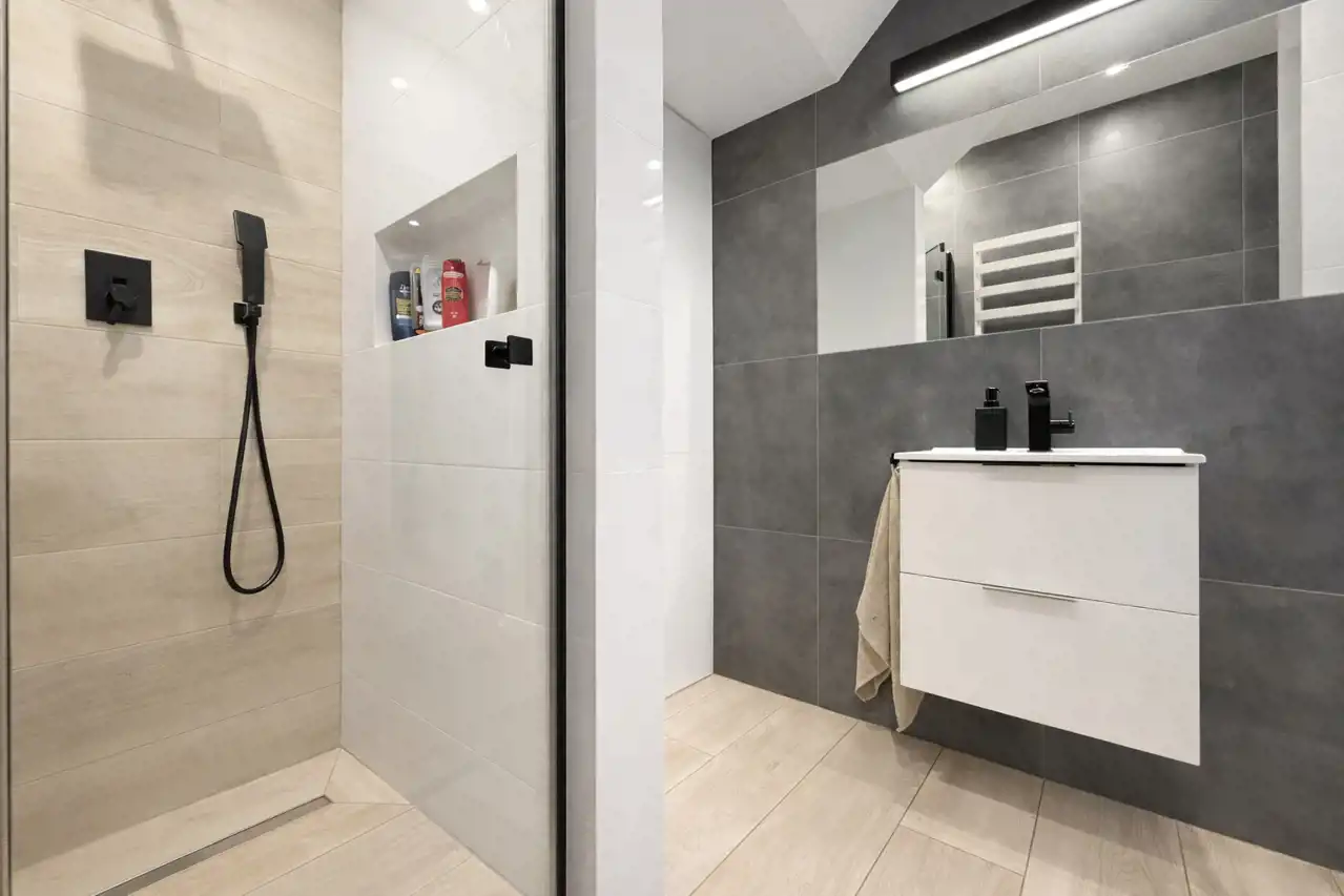 Druga łazienka z prysznicem, dużą wanną i oknem , co podnosi komfort użytkowania.