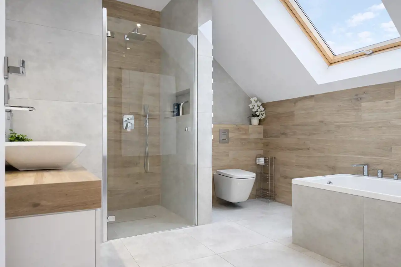 - Łazienka piętro: 7,47 m² (wanna, prysznic, wc, umywalka, szafki)