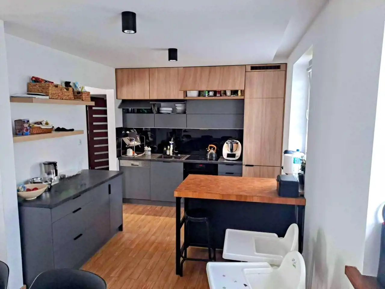 - kuchnia częściowo otwarta na salon z meblami w zabudowie na wymiar, sprzęty AGD