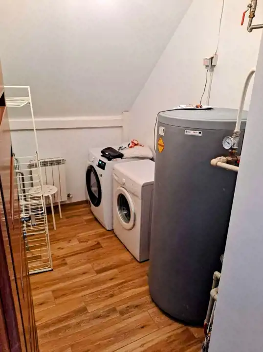 Na parterze domu znajdują się duży salon z wyjściem na taras, sypialnia (gabinet), kuchnia, pomieszczenie gospodarcze (spiżarnia), łazienka z wc, kotłownia. Na poddaszu: 3 sypialnie w tym 1 sypialnia z garderobą, pokój dzienny, łazienka, pralnia.