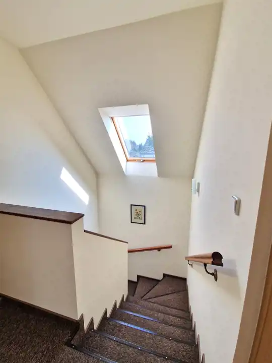 - Dach: spadzisty, pokryty dachówką, docieplony wełną mineralną, drewniany strop