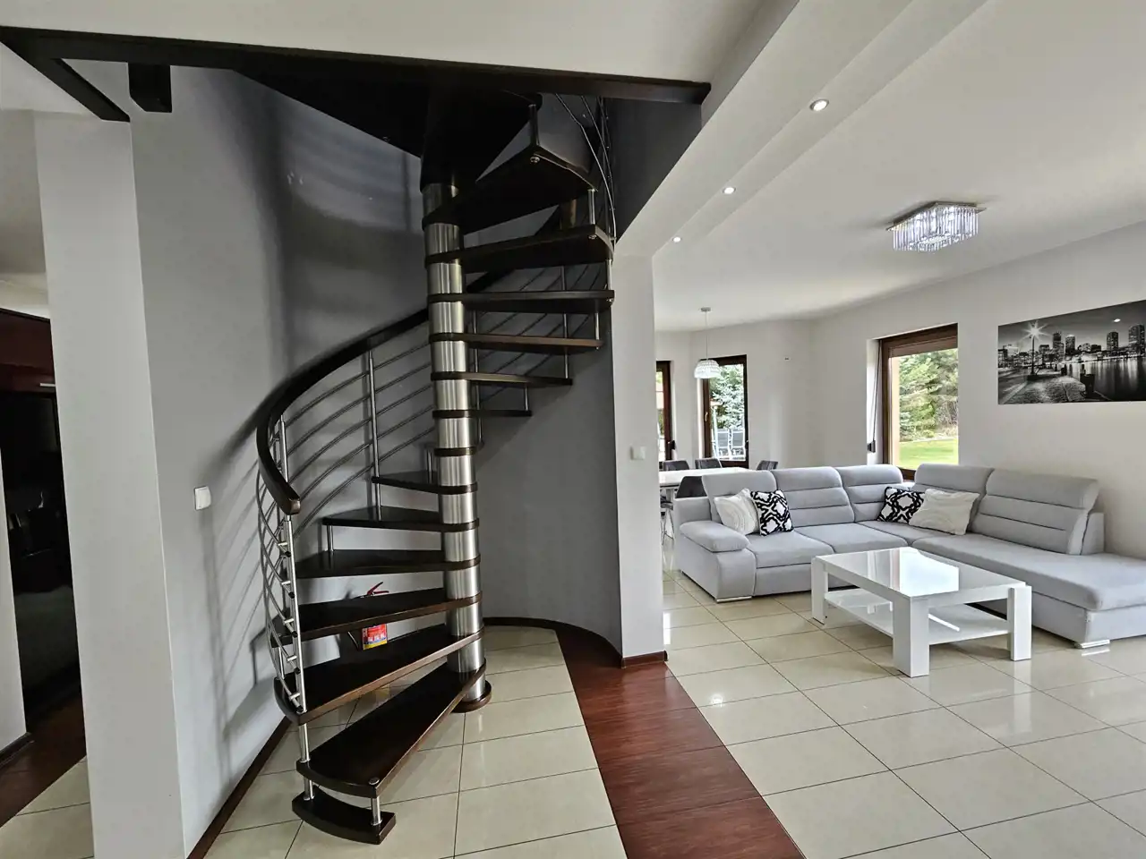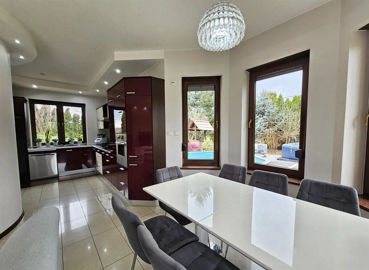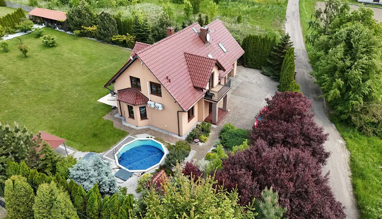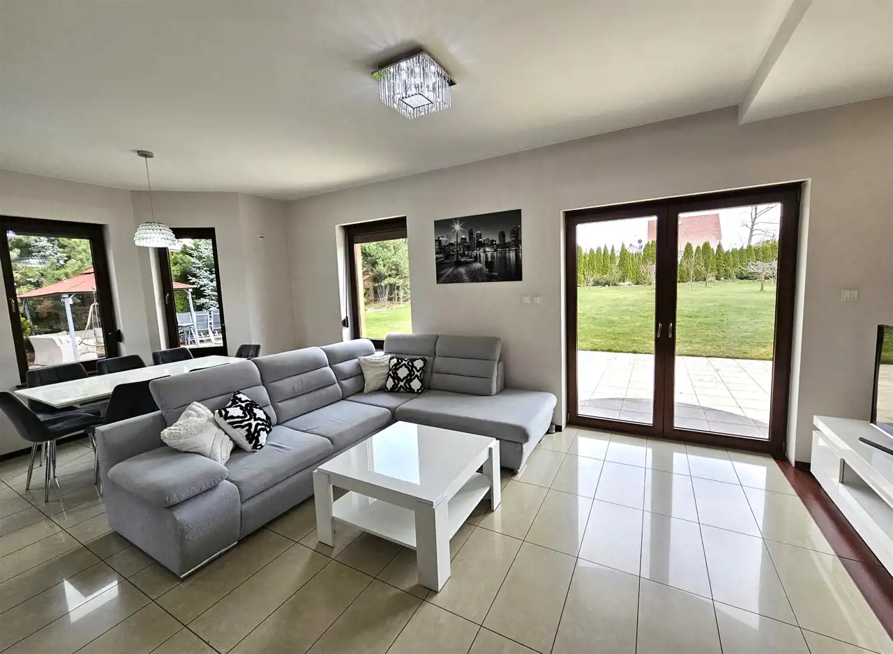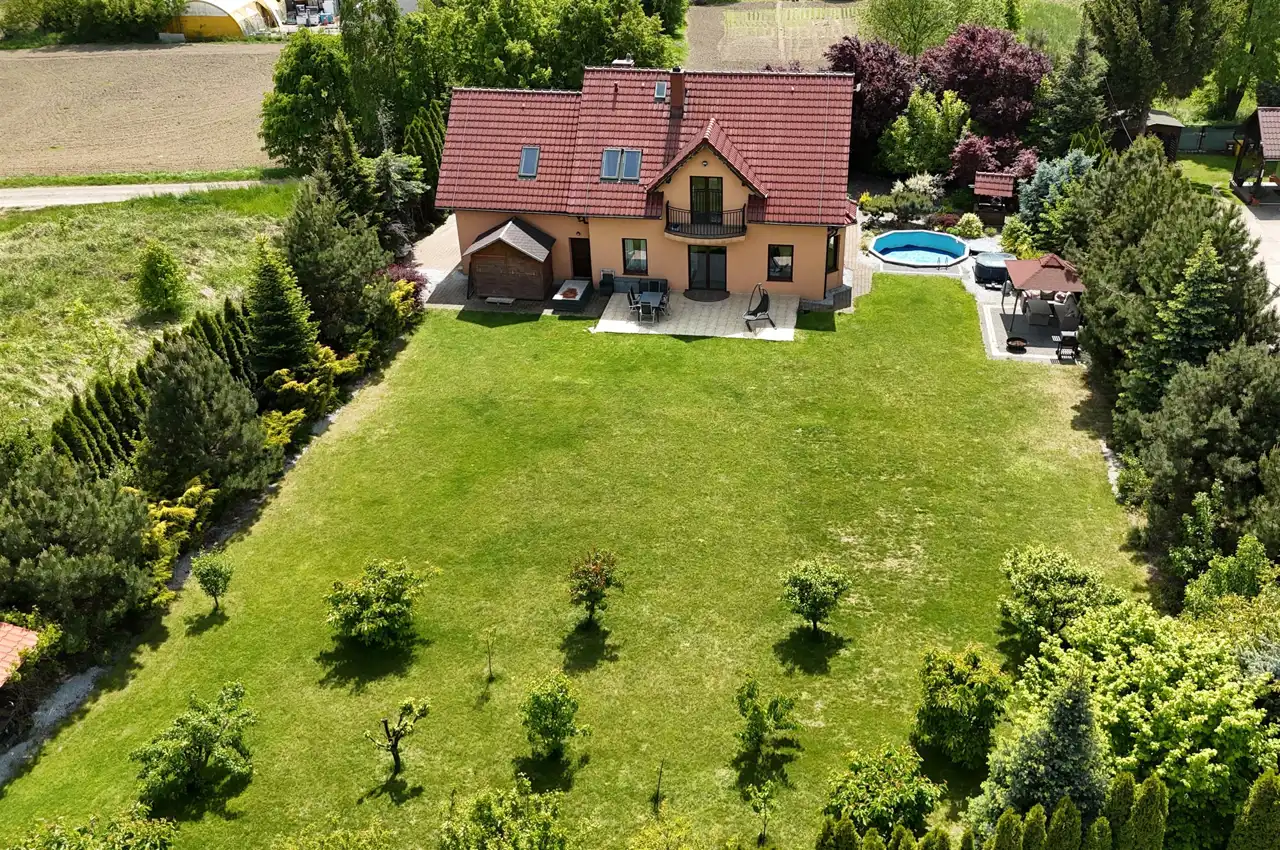 Projekt domu gwarantuje komfortowe i wygodne życie jego mieszkańcom. Dom oraz ogród jest bardzo zadbany i na co dzień utrzymywany w nienagannym stanie technicznym i wizualnym. Otoczenie sprzyja oderwaniu się od miejskiego zgiełku, co pozwala na pełne korzystanie z uroków przyrody. Posiadłość jest idealna dla osób wymagających, ceniących ciszę, spokój i kontakt z naturą, a także wygodę i elegancję. Dom o powierzchni użytkowej ok. 210m2, posiada również dwustanowiskowy garaż.