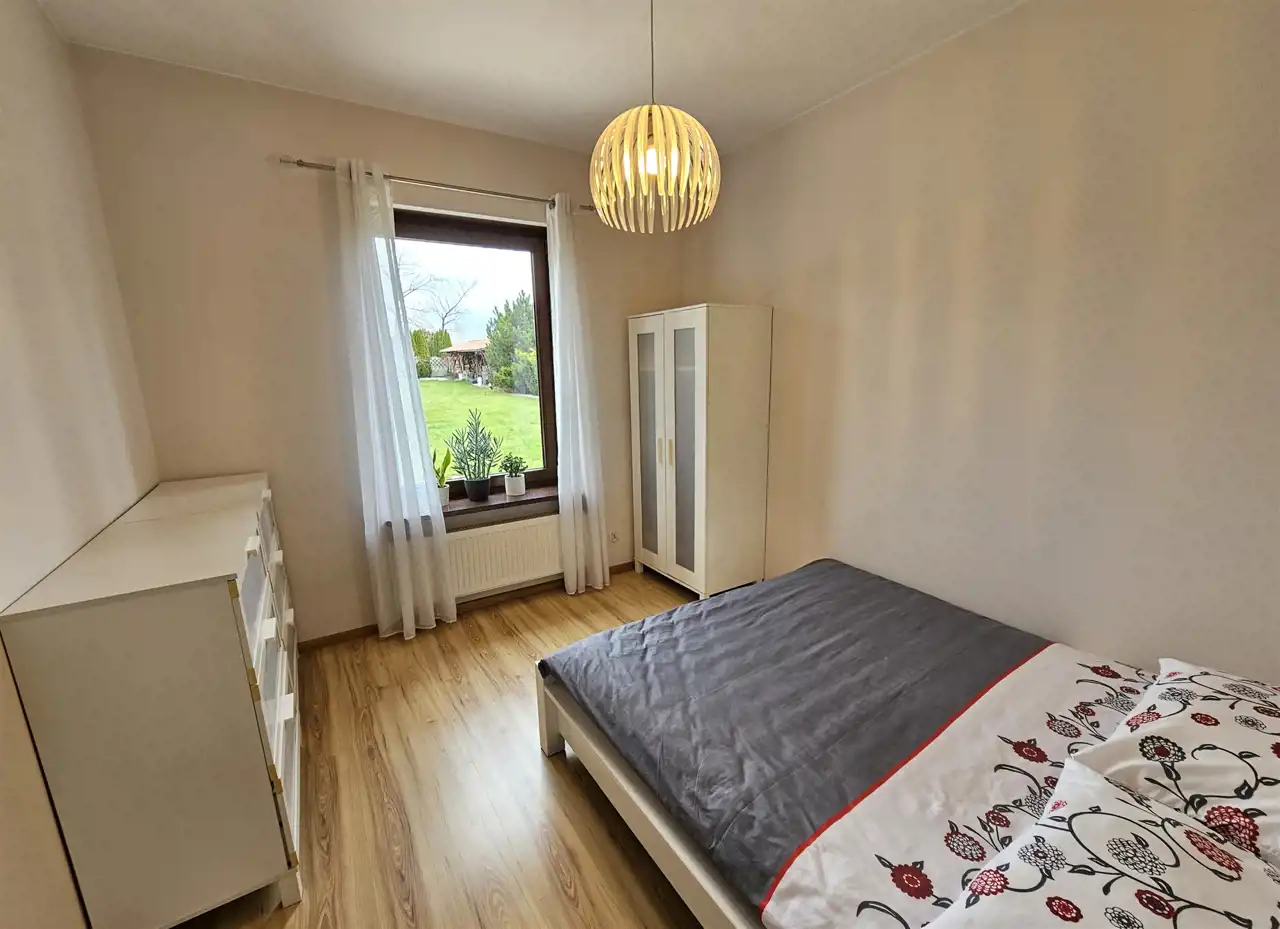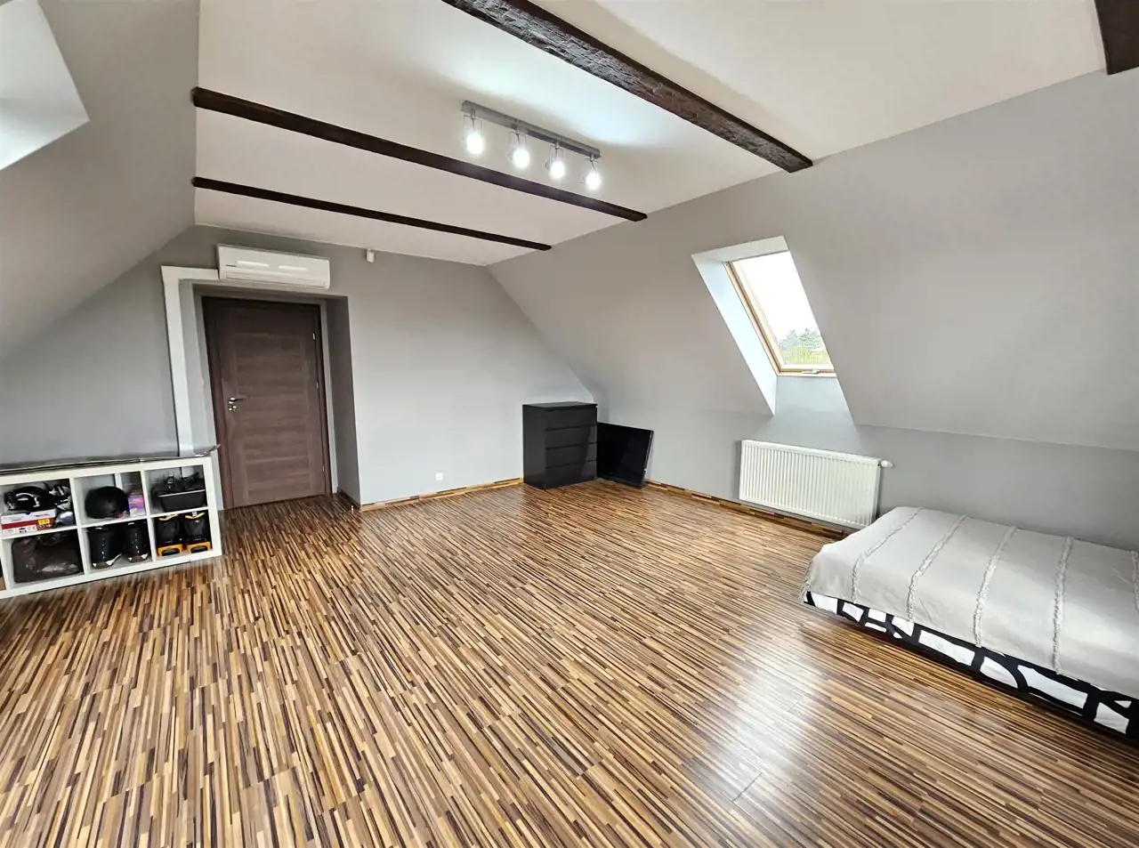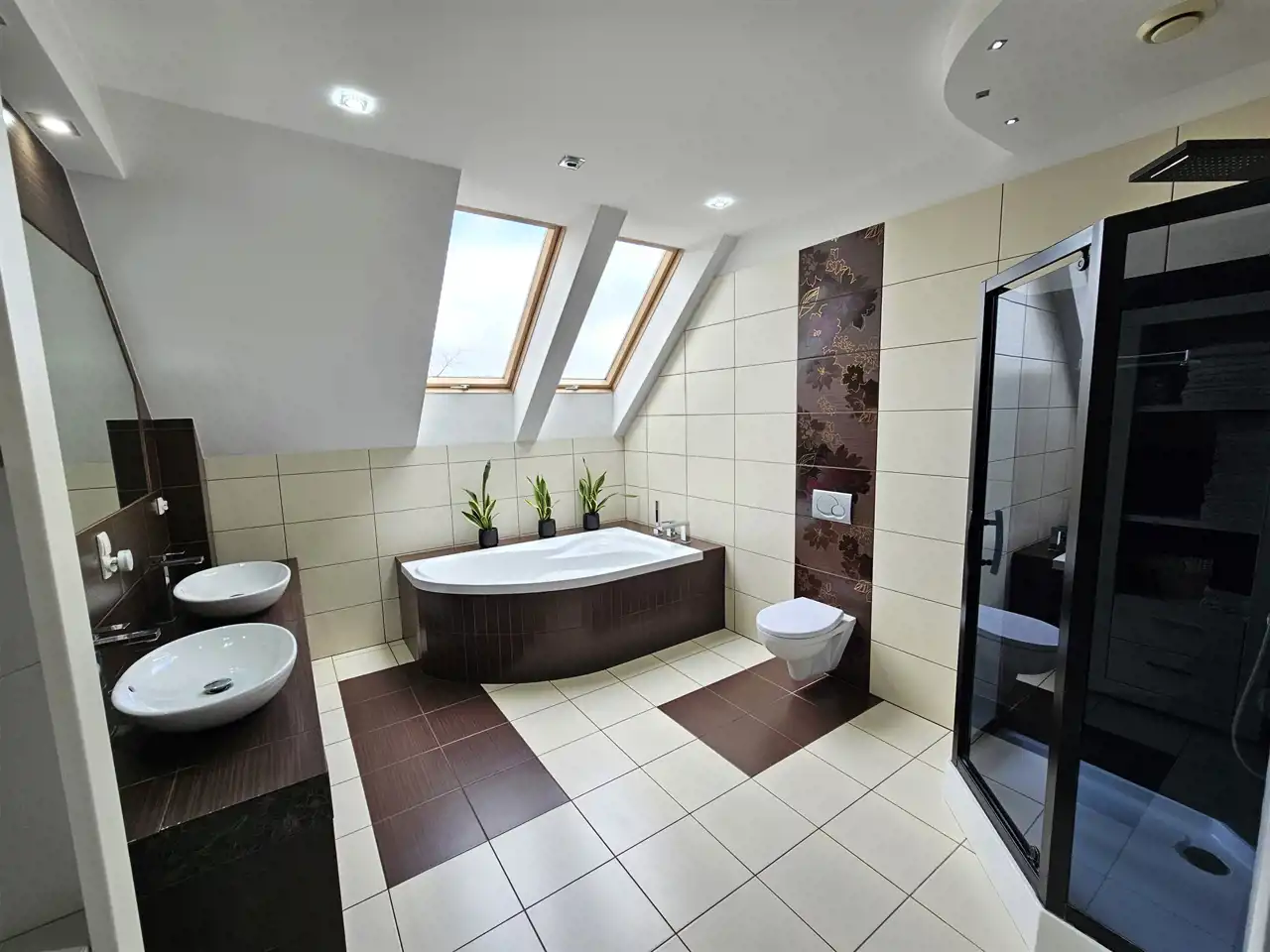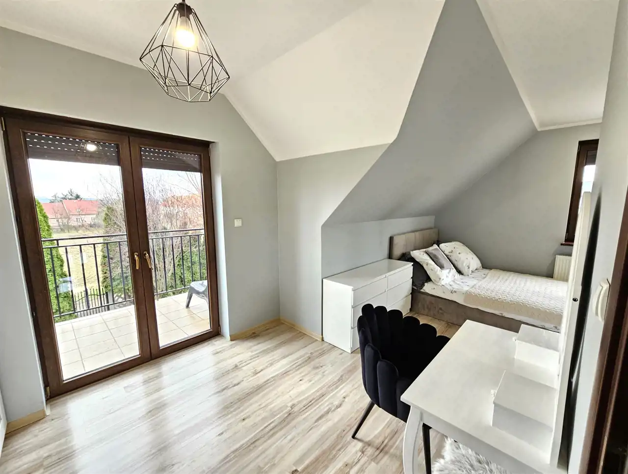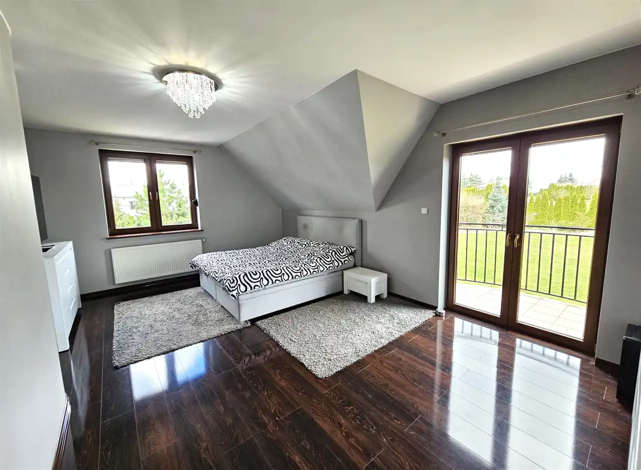 Część dzienna doskonale pełni funkcję reprezentacyjną do przyjmowania gości lub codziennego wypoczynku. Znajdziemy tam przestronny i elegancki salon z kominkiem i dużymi przeszkleniami, z wyjściem na duży taras i ogród, który stanowi idealne miejsce do relaksu na świeżym powietrzu. Mieści się tam również jadalnia oraz w pełni wyposażona i funkcjonalna kuchnia. Duże okna w domu pozwalają na maksymalne korzystanie z naturalnego światła oraz podziwianie piękna otaczającego krajobrazu. Na parterze mieści się również gościnna sypialnia, toaleta z kabiną prysznicową, holl oraz pomieszczenie gospodarcze/kotłownia. Cześć prywatna znajduje się na piętrze domu i składa się z trzech przestronnych i komfortowych pokoi, dwóch balkonów, osobnej garderoby, pokoju kąpielowego z dwiema umywalkami, kabiną prysznicową i wanną, korytarza. Nad piętrem znajduje się dodatkowa przestrzeń strychowa, która może służyć jako dodatkowy schowek.