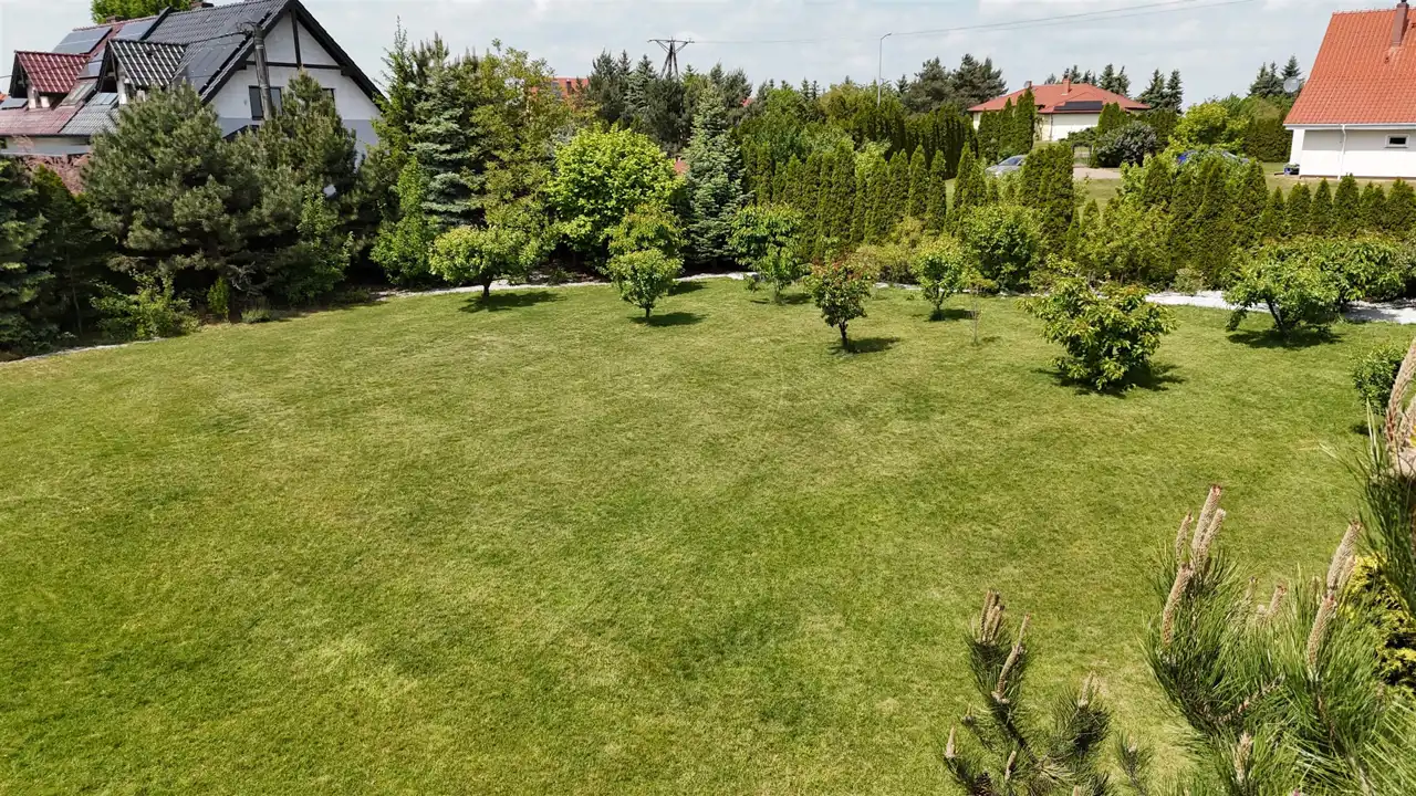 Działka ma regularny kształt, jej powierzchnia wynosi 1925m2, jest bardzo ładnie zagospodarowana. Ogród składa się z zadbanego trawnika i nasadzeń w postaci pięknych kwiatów, krzewów i drzew. Na ogrodzie znajdziemy m.in. okrągły basen ziemny, wolnostojące jacuzzi, taras z meblami wypoczynkowymi, miejsce przeznaczone do grillowania, co doskonale sprawdza sią jako strefa wypoczynku czy relaksu. Przed domem znajduje się podjazd wyłożony kostką oraz garaż dwustanowiskowy, położony w bryle budynku. Teren jest w całości ogrodzony i zamykany automatyczną bramą wjazdową.