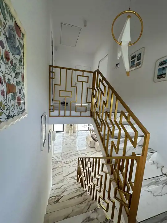 Na etapie budowy domu zostały naniesione zmiany w projekcie, które pozwoliły uzyskać najbardziej funkcjonalny rozkład. Do wykończenia domu użyto wysokiej jakości materiałów a samo wnętrze jest urządzone z dużym wyczuciem i dbałością o każdy szczegół, przeważają stonowane kolory, czarne okna i drzwi, białe meble i złote dodatki świetnie się ze sobą komponują. Dopełnienie stanowi harmonijne dobrane oświetlenie z włącznikami w systemie smart.