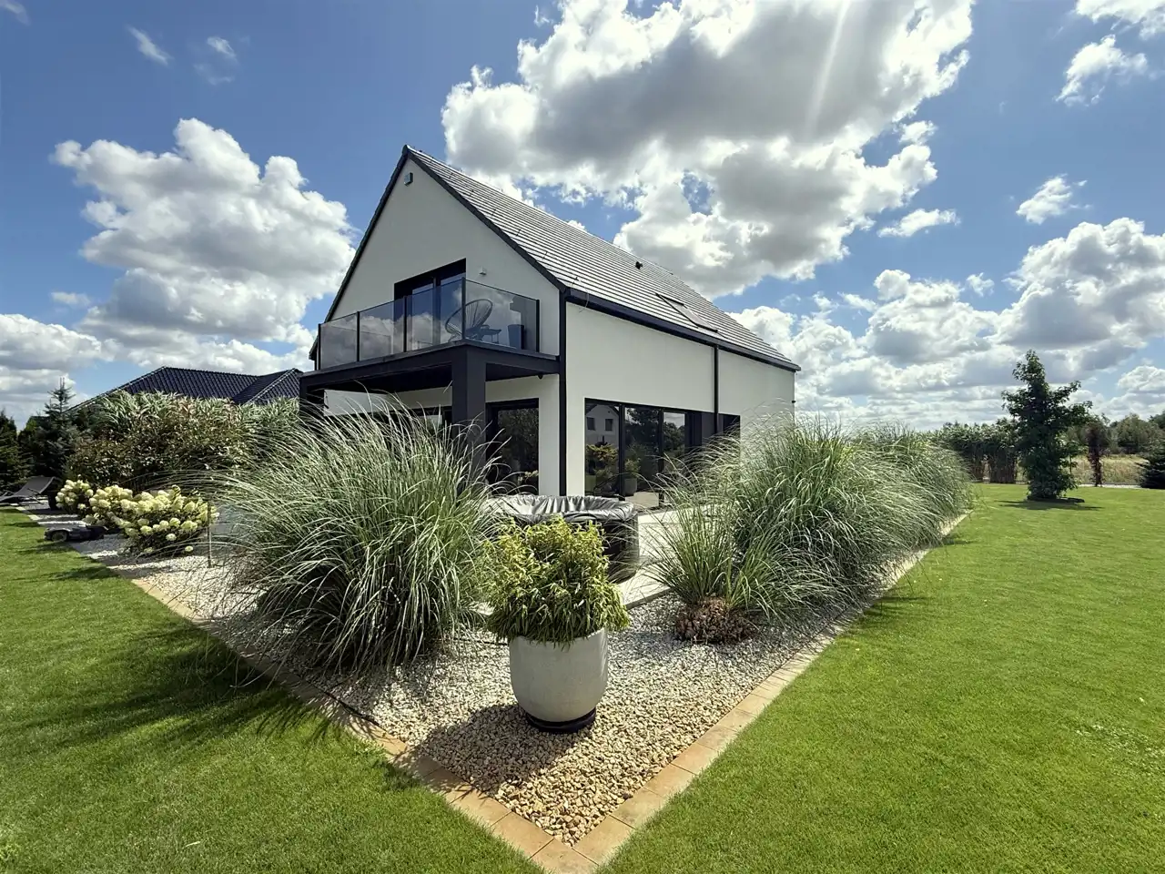 - starannie utrzymany ogród z dużą ilością drzew (m.in. świerki, jodły, sosny, brzózki) krzewów (m.in. miskanty japońskie i olbrzymie, trzmielina, trawa pampasowa), z tyłu domu wydzielony przydomowy ogródek z ziołami, krzewami i drzewkami owocowymi;
