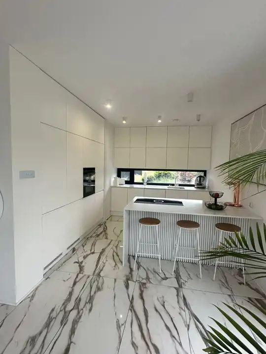 - kuchnia z nowoczesną zabudową meblową pod sufit, blaty - konglomerat, pełny sprzęt AGD oraz wyspa kuchenna w wbudowanym okapem;