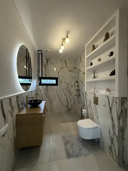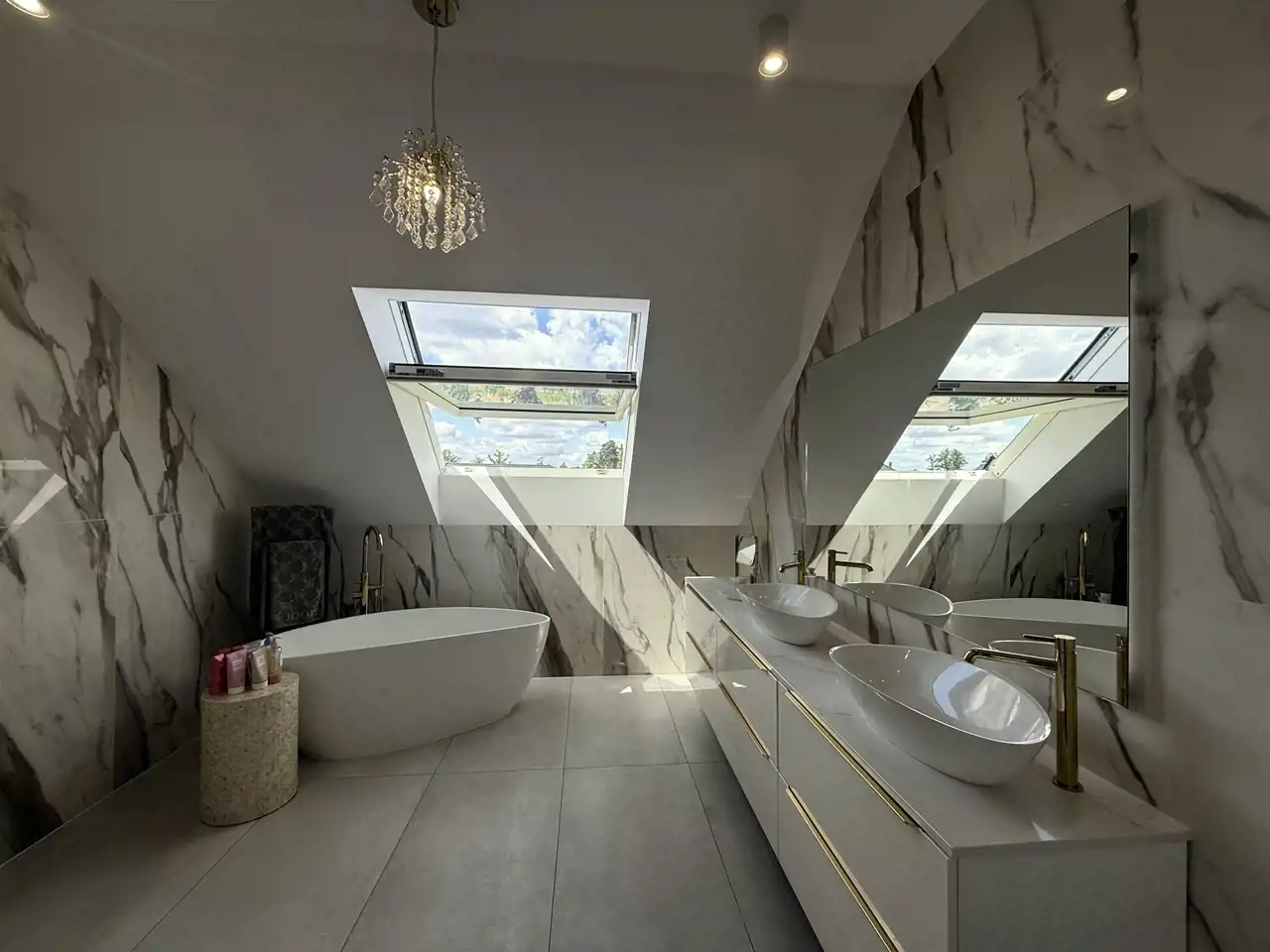 - stylowo zaprojektowane łazienki z modną armaturą (łazienka dolna wyposażona w prysznic, górna w wannę);