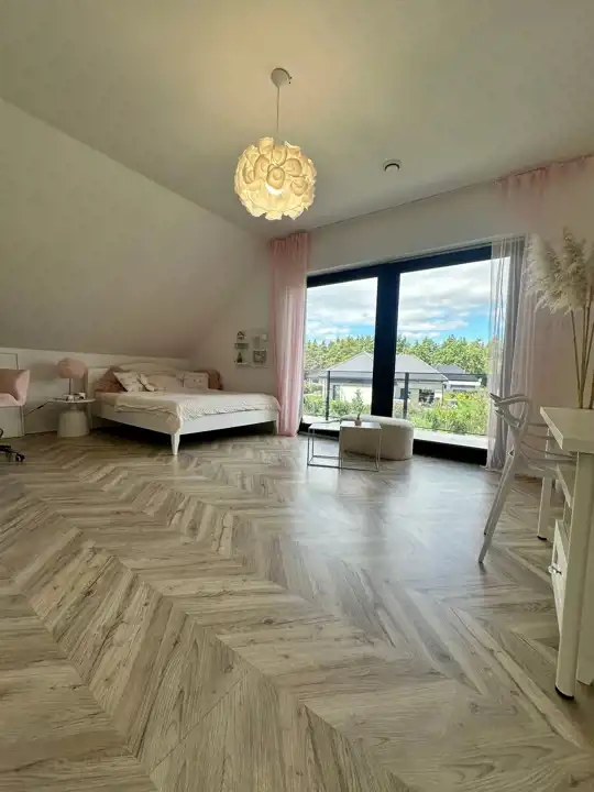Piętro domu to 3 sypialnie (obecnie 1 z sypialni jest przerobiona na oddzielną garderobę), łazienka z oknem. Warto zaznaczyć, że największa sypialnia posiada ponad 30 m2 z wyjściem na balkon i wydzieloną garderobą.