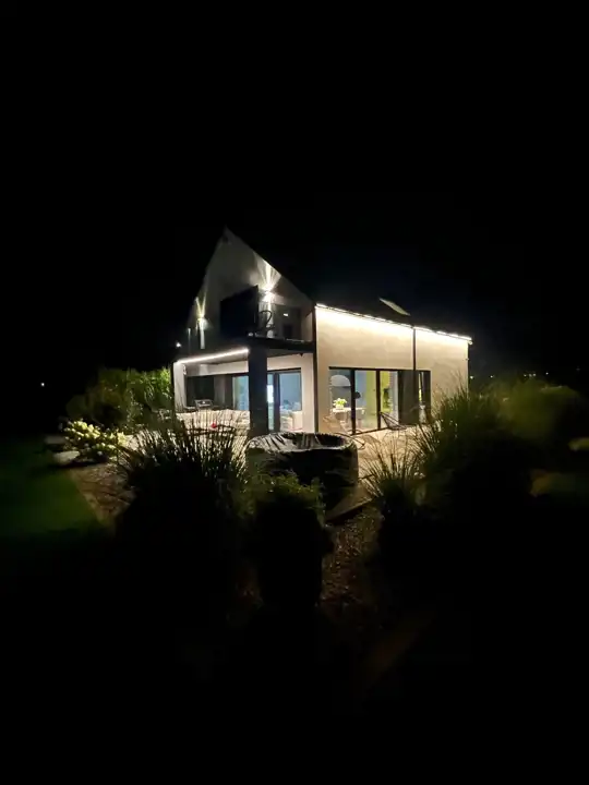 Na etapie budowy domu zostały naniesione zmiany w projekcie, które pozwoliły uzyskać najbardziej funkcjonalny rozkład. Do wykończenia domu użyto wysokiej jakości materiałów a samo wnętrze jest urządzone z dużym wyczuciem i dbałością o każdy szczegół, przeważają stonowane kolory, czarne okna i drzwi, białe meble i złote dodatki świetnie się ze sobą komponują. Dopełnienie stanowi harmonijne dobrane oświetlenie z włącznikami w systemie smart.