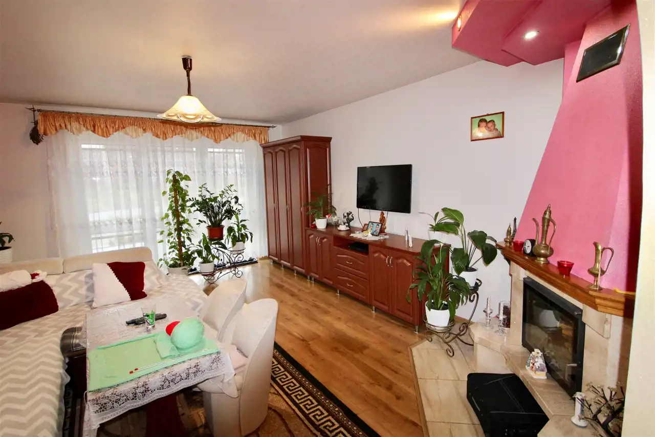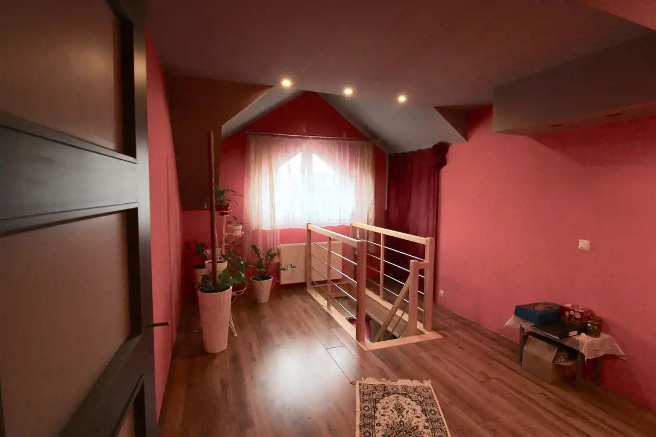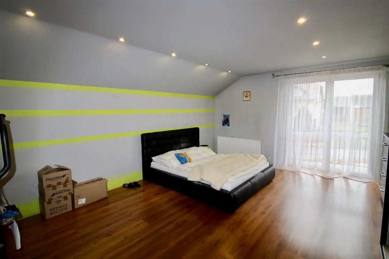 Dom wybudowany z suporeksu w 2012 roku jako dom 2-rodzinny z oddzielnymi wejściami oraz rozdzielonymi instalacjami, posiadający 6 pokoi, 2 salony, 2 kuchnie, jadalnię oraz 3 łazienki. Dom wyposażony w pompę ciepła, piec na ekogroszek, panele fotowoltaiczne 10 KW, media: prąd, woda, oczyszczalnia ekologiczna.