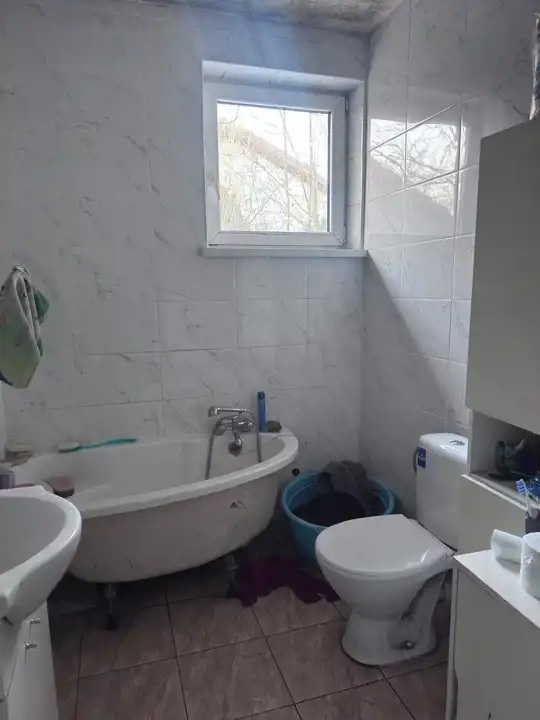 - Łazienka: Wykończona w jasnej glazurze, wyposażona w wannę i WC.
