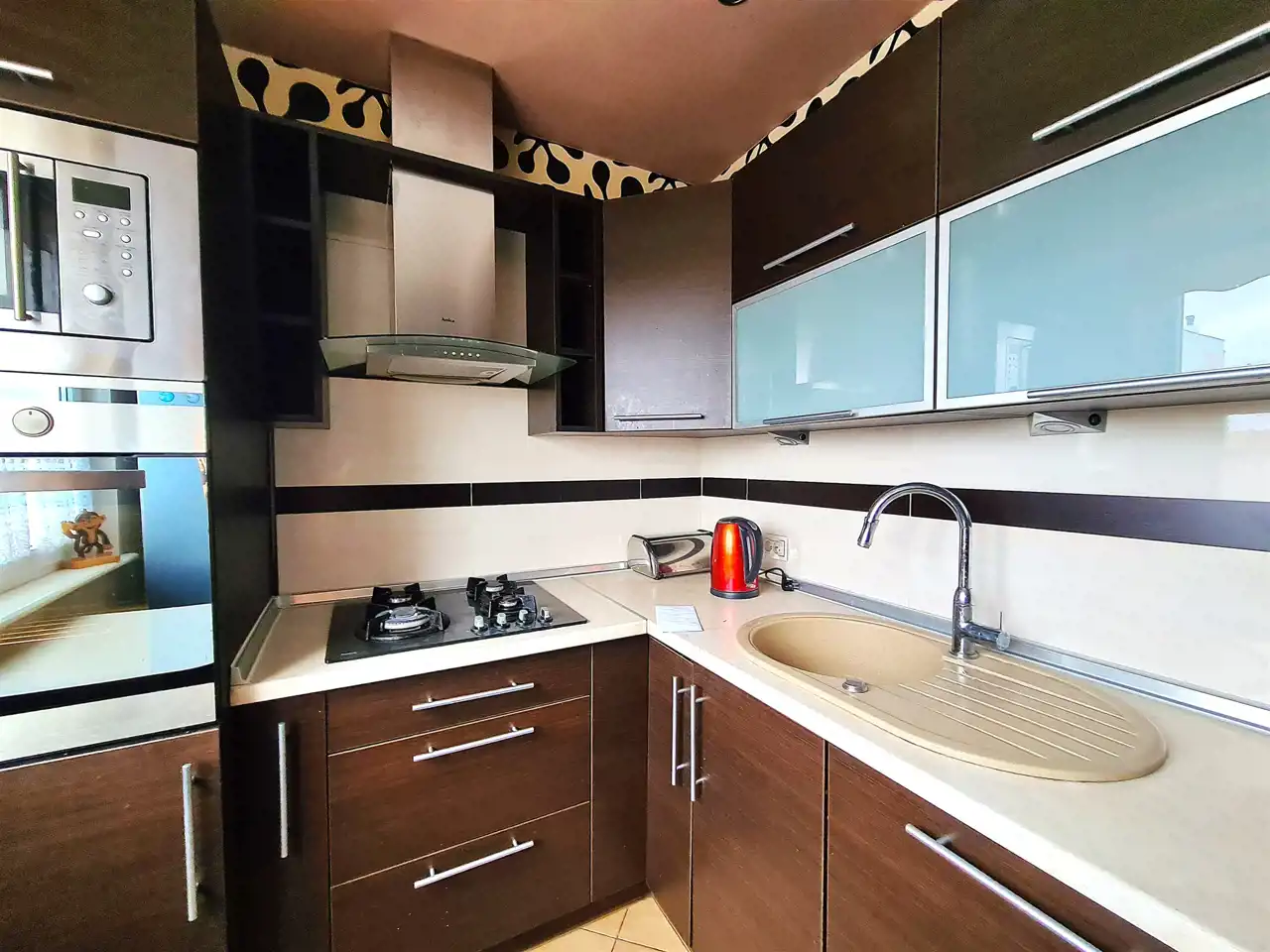 Kuchnia jest wygodna , ustawna , widna , w ciepłej kolorystyce i doskonale wyposażona w: gazową płytę grzejną ( gaz z butli propan-butan), piekarnik , kuchenkę mikrofalową w zabudowie, chłodziarko-zamrażarkę również zabudowaną , express do kawy , wszelkie szafki uchylne i wysuwane , a także nieduży stół śniadaniowy . Blaty i fronty są nowoczesne.