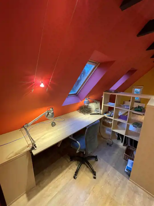 - duży otwarty salon z wyodrębnionym pomieszczeniem biurowym