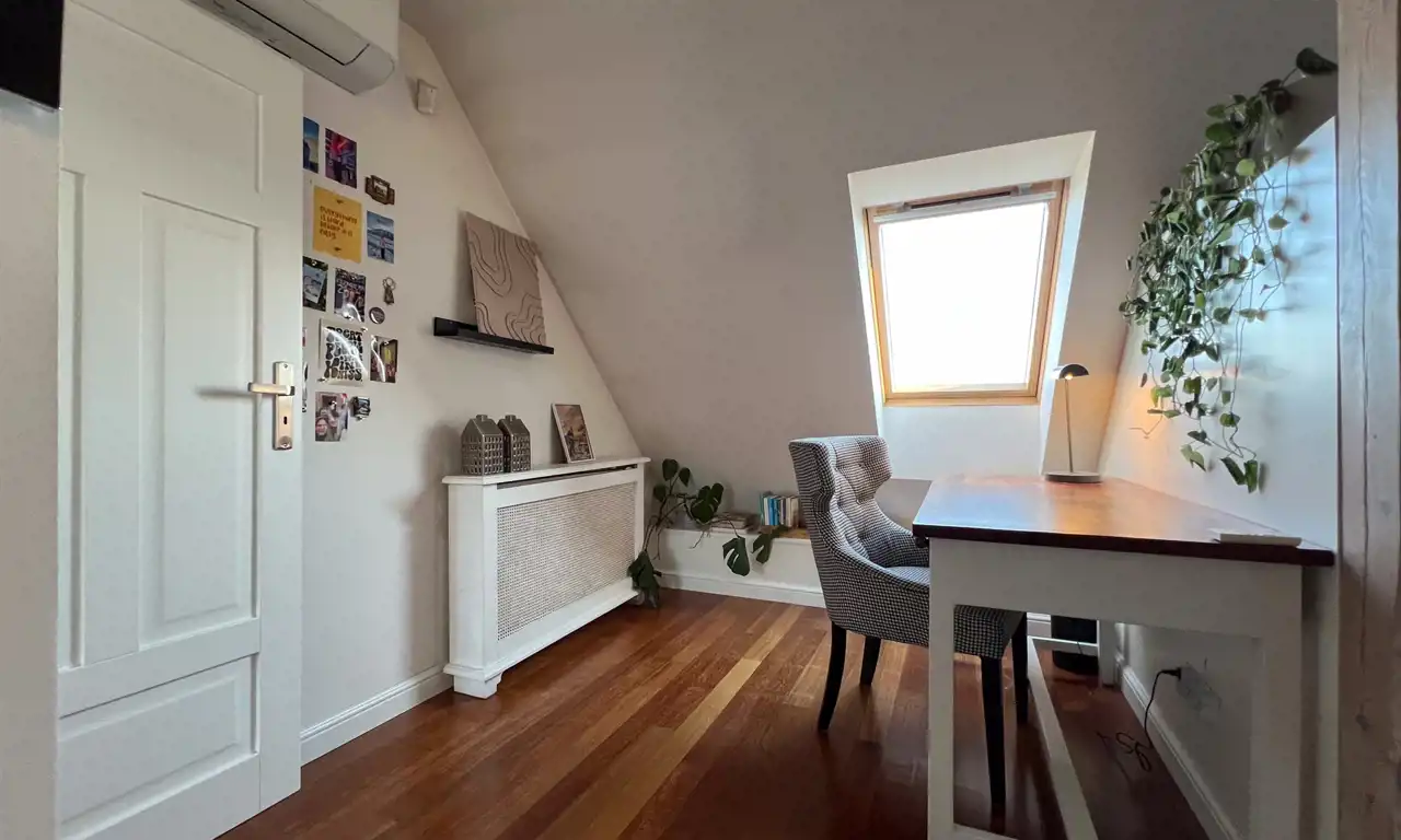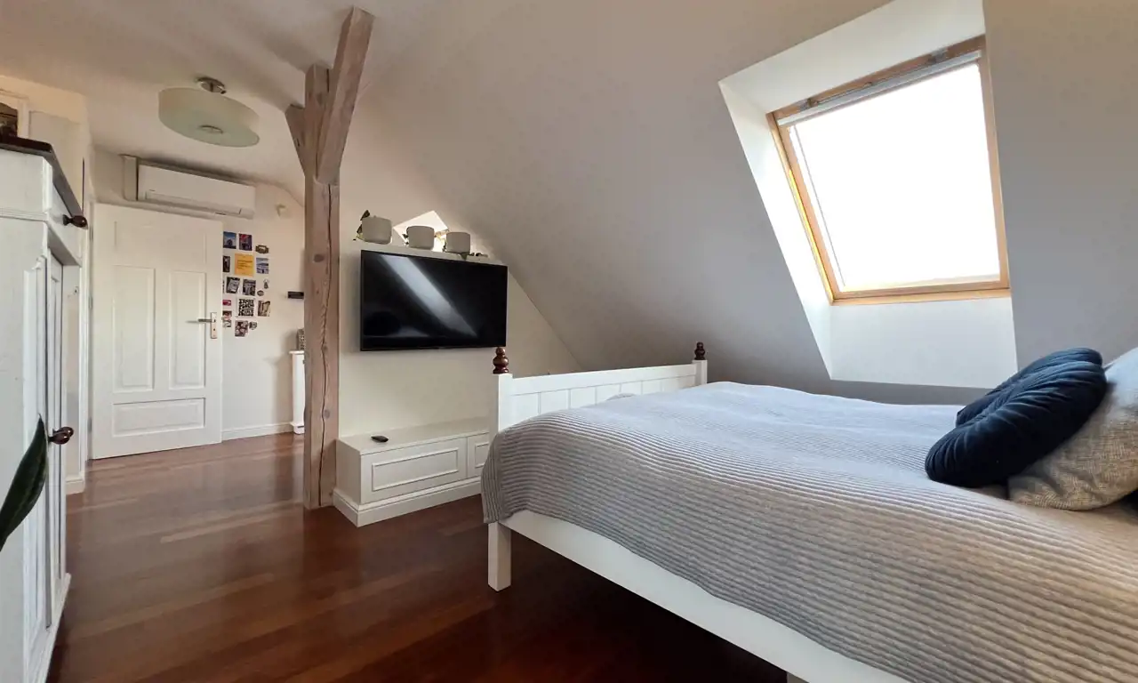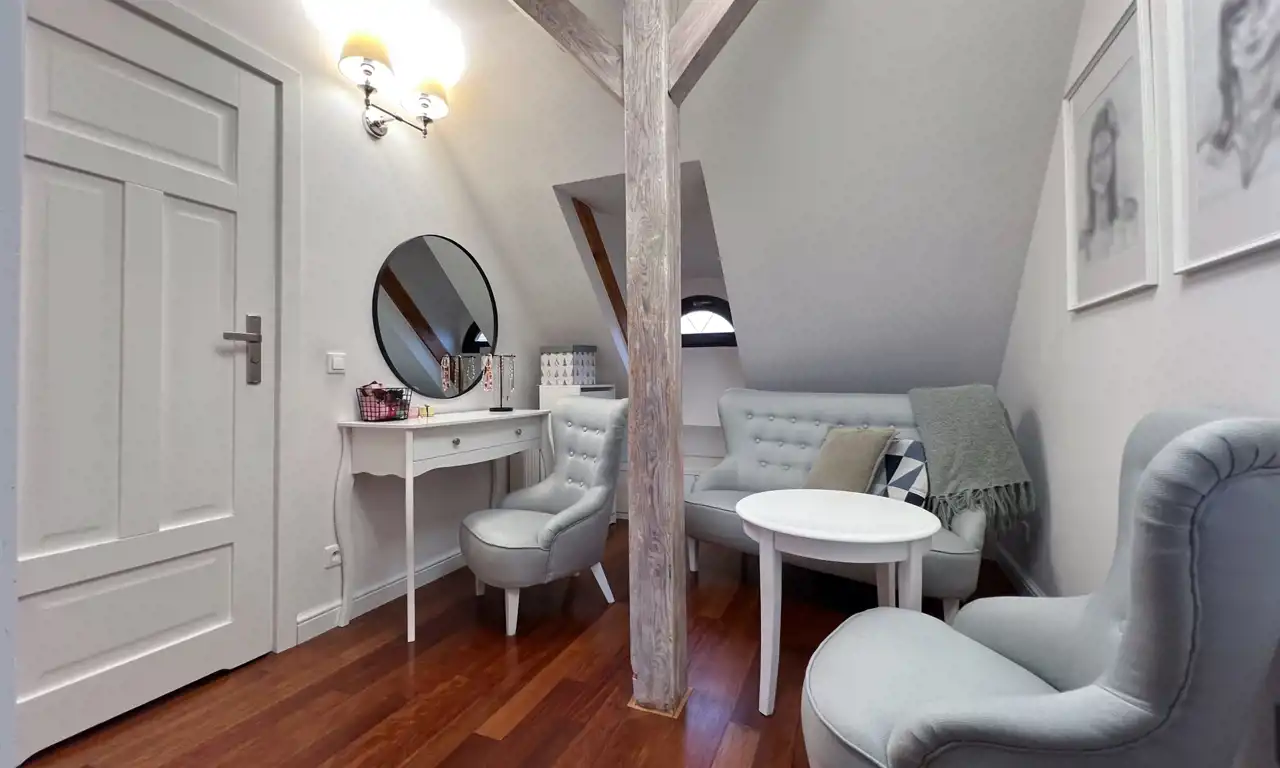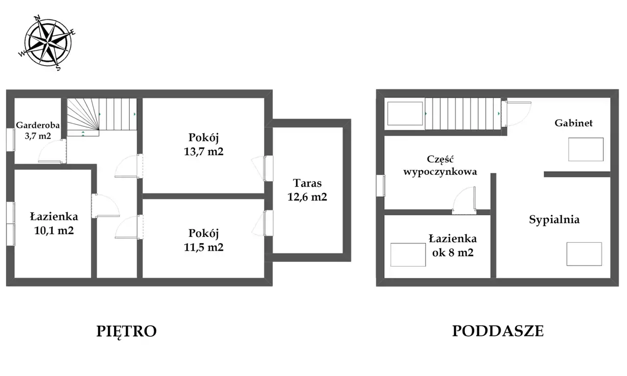 Dwa poziomy ponad parterem to typowo prywatna część domu. Na pierwszym piętrze znajdują się dwie sypialnie z wyjściem na duży balkon, garderoba oraz przestronna łazienka z wanną i prysznicem. Prawdziwą perełkę i przestrzeń, o która z pewnością powstaną największe dyskusje przy podziale pokoi, przez nowych właścicieli, stanowi poddasze. Cała ta przestrzeń to praktycznie jedno duże pomieszczenie podzielone na kilka stref: miejsce do pracy/nauki, sypialnie, łazienkę oraz część, którą na pewno bardzo docenią Panie, czyli przestrzeń zaraz przy łazience, w której znajduję się toaletka oraz miejsce do wypicia kawy lub spędzenia czasu z książką.