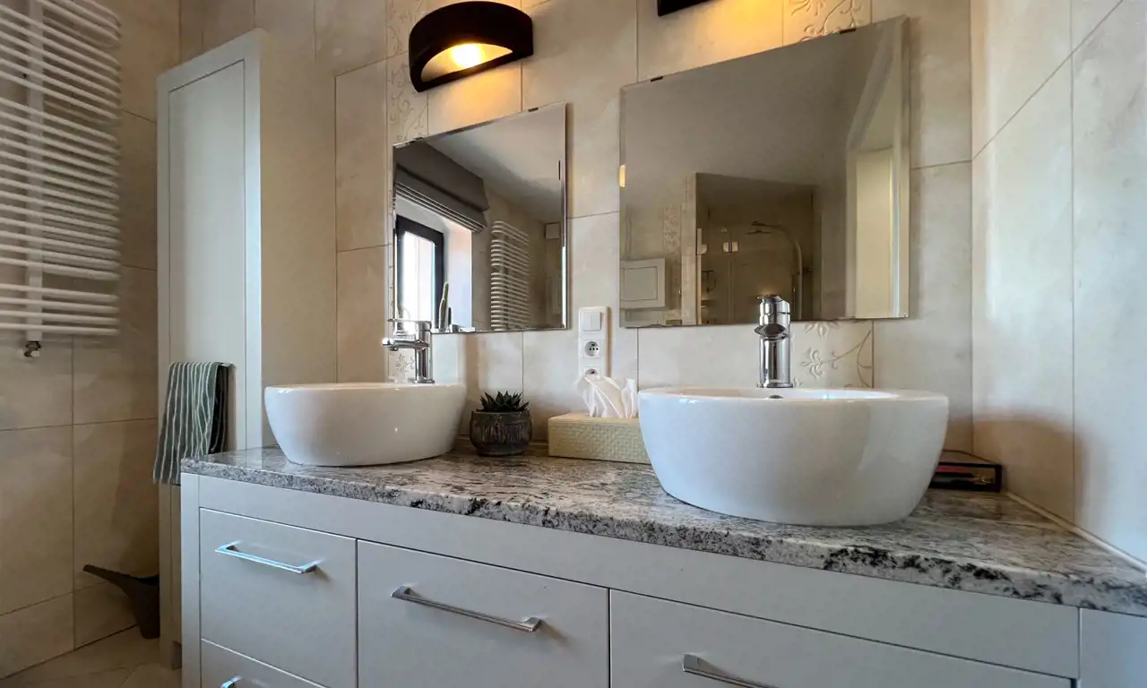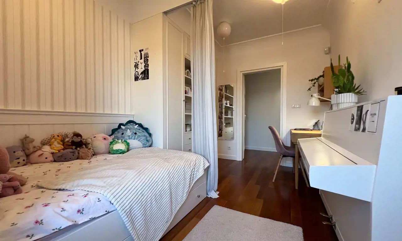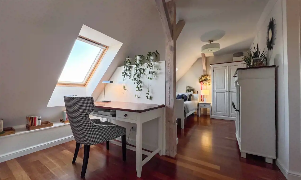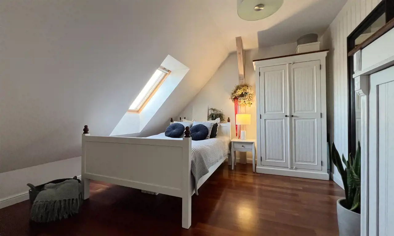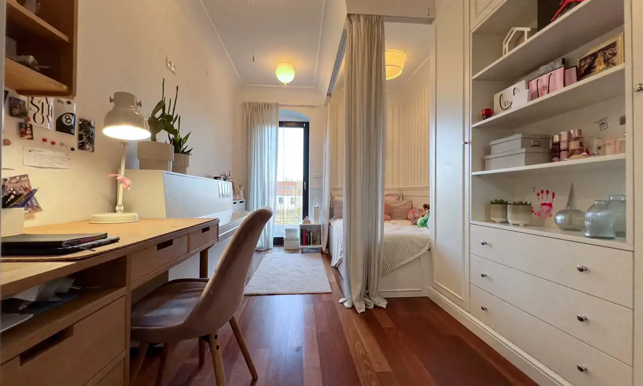 Dwa poziomy ponad parterem to typowo prywatna część domu. Na pierwszym piętrze znajdują się dwie sypialnie z wyjściem na duży balkon, garderoba oraz przestronna łazienka z wanną i prysznicem. Prawdziwą perełkę i przestrzeń, o która z pewnością powstaną największe dyskusje przy podziale pokoi, przez nowych właścicieli, stanowi poddasze. Cała ta przestrzeń to praktycznie jedno duże pomieszczenie podzielone na kilka stref: miejsce do pracy/nauki, sypialnie, łazienkę oraz część, którą na pewno bardzo docenią Panie, czyli przestrzeń zaraz przy łazience, w której znajduję się toaletka oraz miejsce do wypicia kawy lub spędzenia czasu z książką.