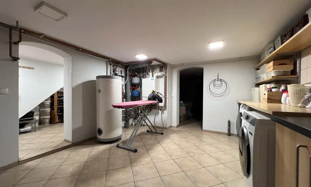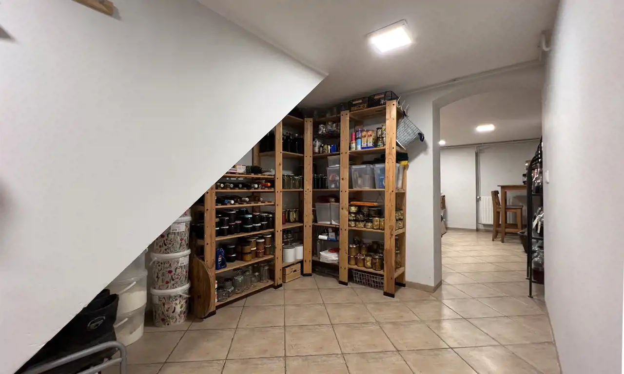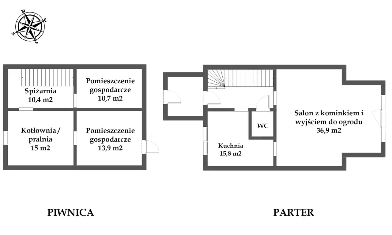 Serce domu stanowi przestronny salon z jadalnią, kominkiem i wyjściem na ogród. Z salonu można też przejść do otwartej kuchni oraz toalety. Poziom niżej mamy piwnicę, która jest doskonałym uzupełnieniem funkcjonalności domu. Znajdują się tutaj: spiżarnia, pomieszczenie pełniące dawniej rolę drugiej kuchni, pomieszczenie gospodarcze mogące być tak bardzo przydatną przestrzenią magazynową oraz bardzo duża pralnia, która znacząco ułatwi codzienne obowiązki.