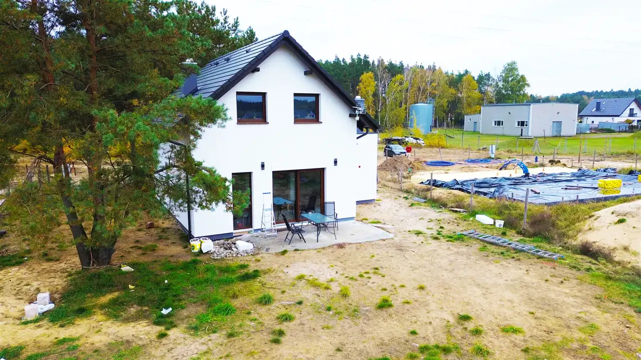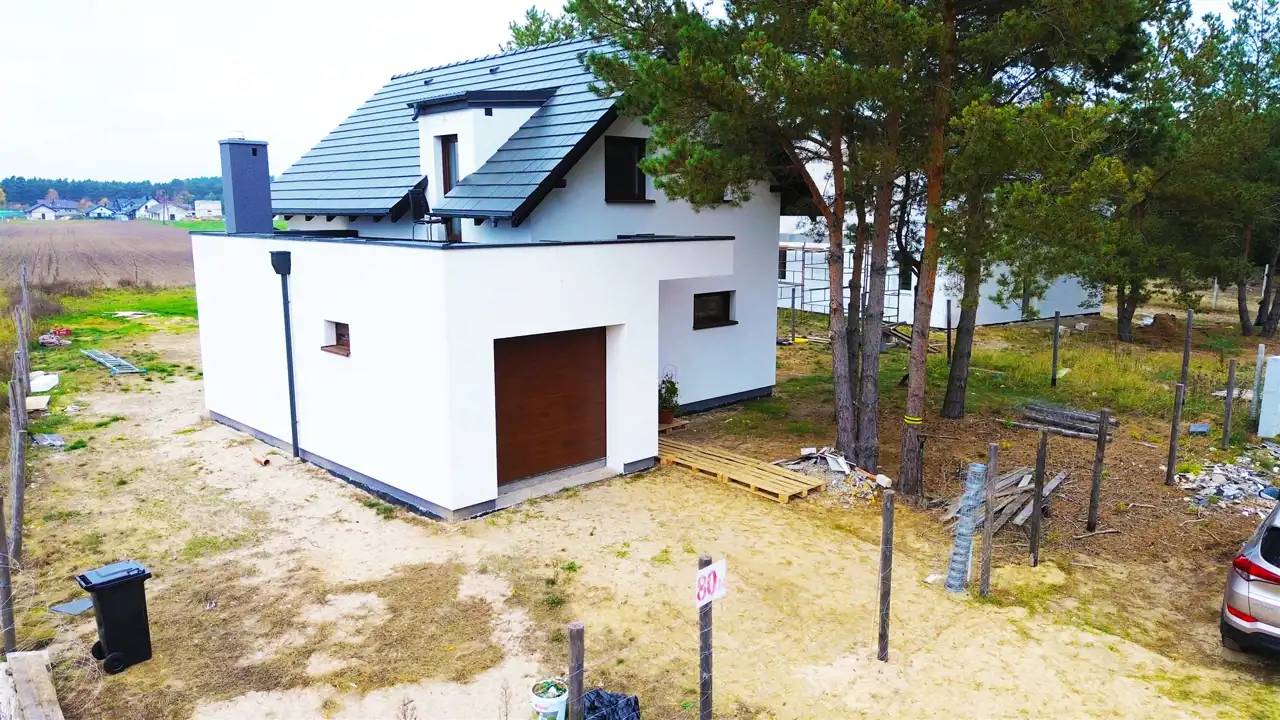 Dom został wykonany z betonu komórkowego i został docieplony styropianem, co zapewnia niskie koszty utrzymania.