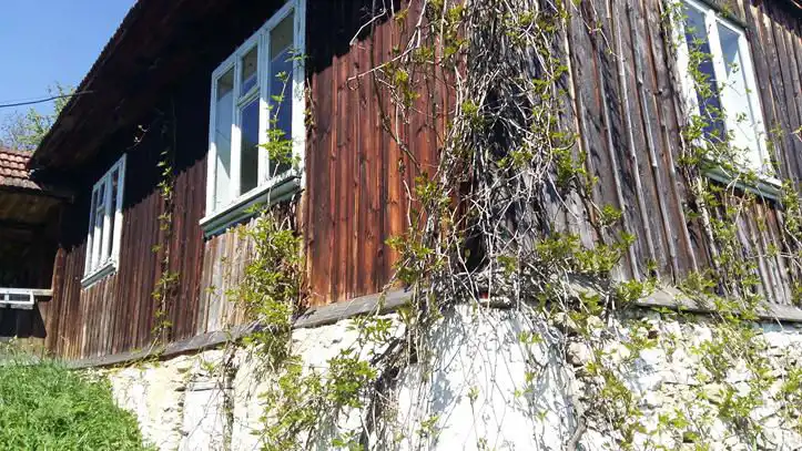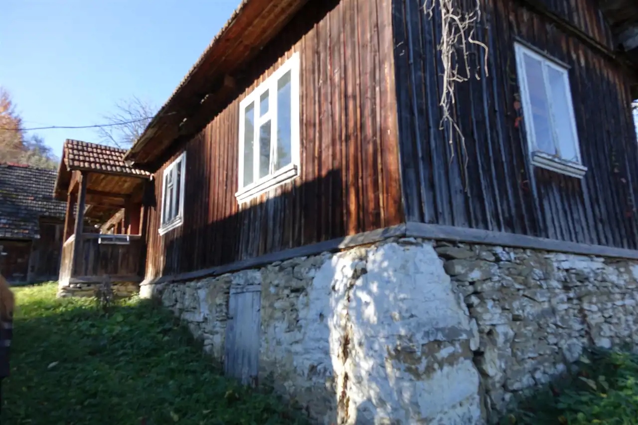 Dom o powierzchni całkowitej 75 m2, zbudowany z bala, na kamiennej podmurówce, dach przykryty dachówką cementową.