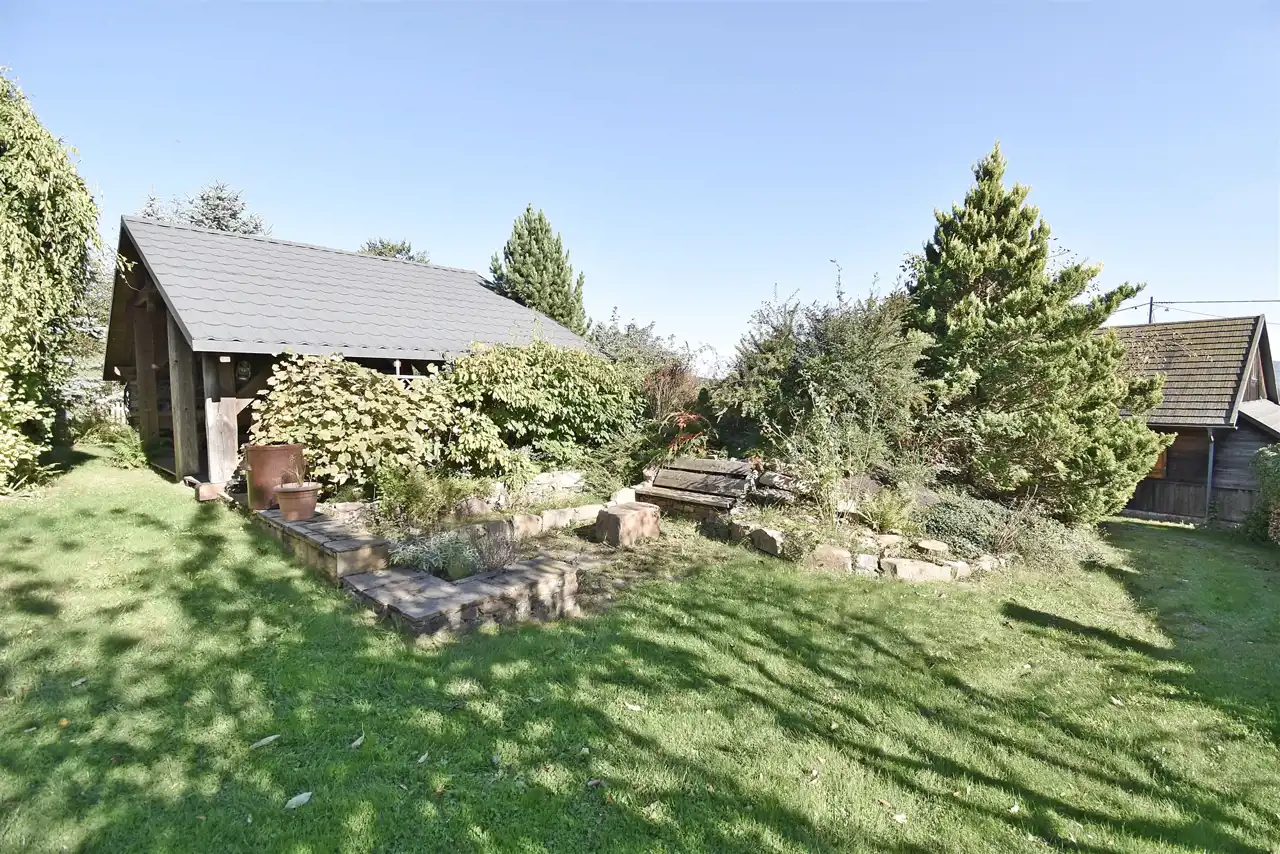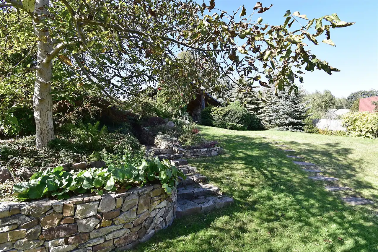 Nieruchomość położona jest w sąsiedztwie domów jednorodzinnych, w atrakcyjnej i spokojnej lokalizacji z widokiem na panoramę Gór Świętokrzyskich. Teren działki jest urozmaicony, pochyły, ogrodzony, zadbany, z wieloletnimi nasadzeniami. Podjazd do garażu wyłożony został kostką kamienną.