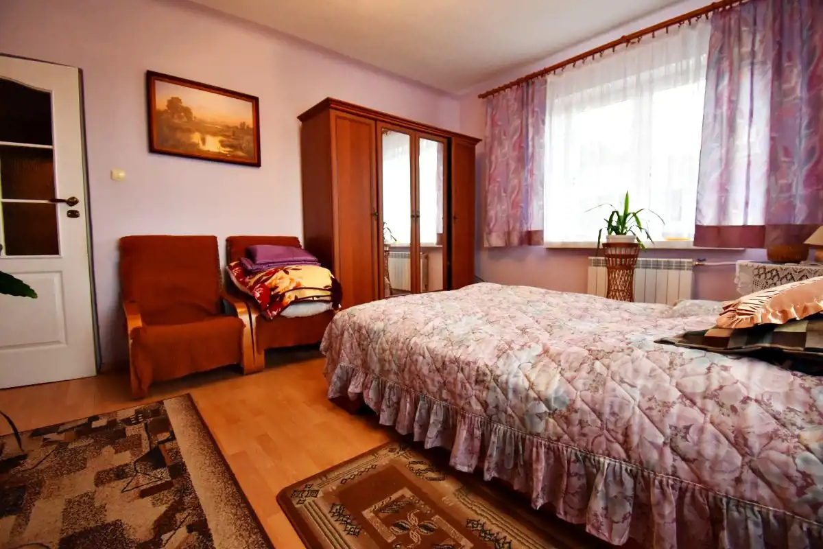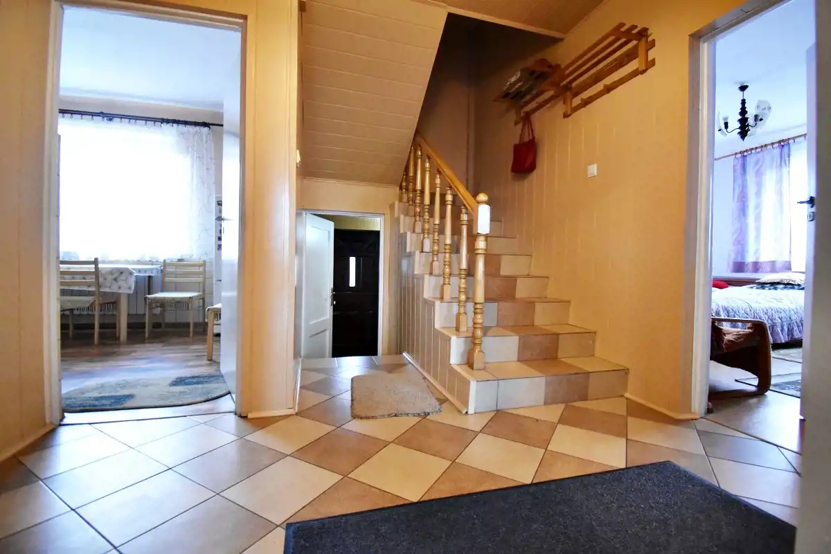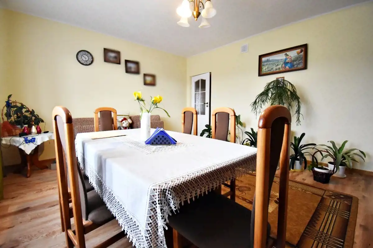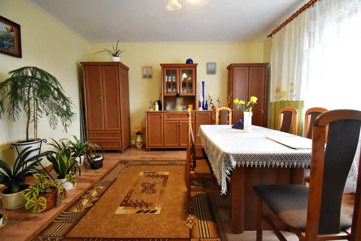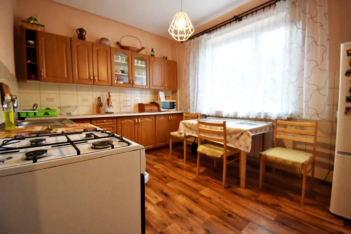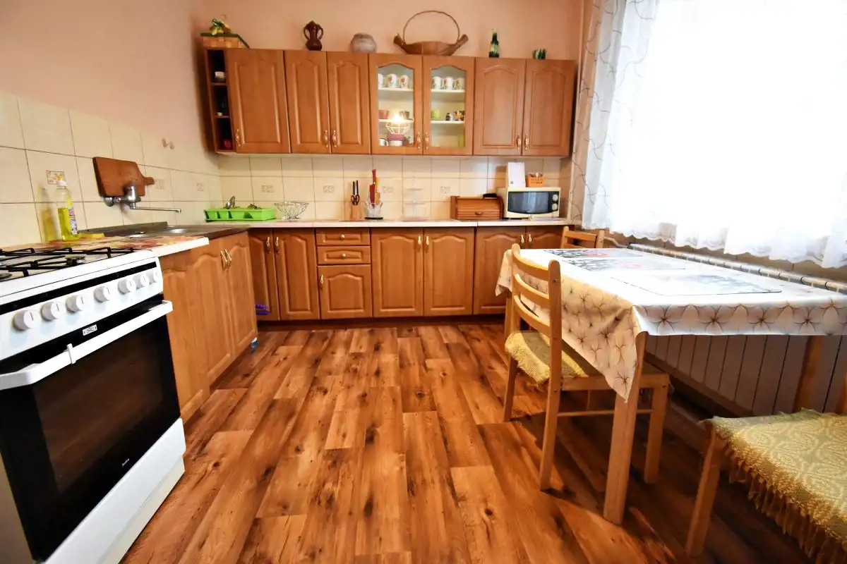 The windows are partially PVC and partially wooden. The property has replaced radiators, laminate flooring in the rooms, tiles in the hallway and bathroom, and linoleum in the kitchen. The hot water and heating are provided by a solid fuel furnace (installed 2 years ago).
