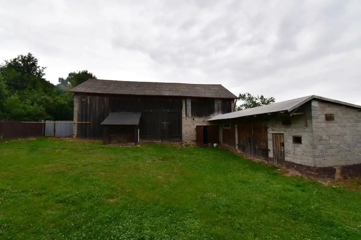 The property also includes outbuildings: a storage barn (approximately 127 sqm), a cowshed (approximately 45 sqm), an old barn (approximately 130 sqm), and a garage (approximately 35 sqm).