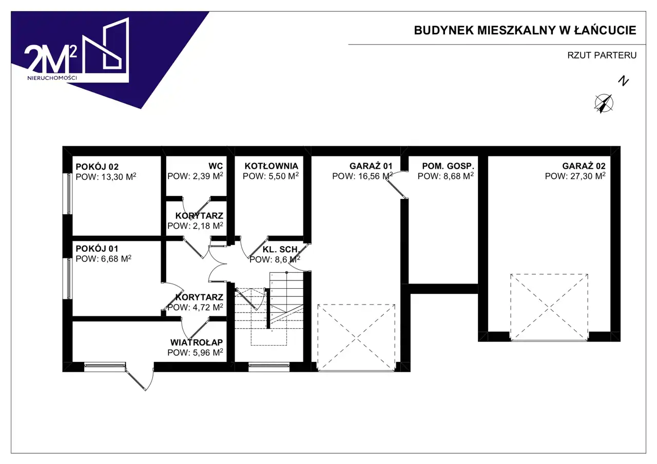 - wiatrołap, dwa pokoje, łazienka, kotłownia, korytarze, klatka schodowa, dwa garaże oraz pom. gospodarcze