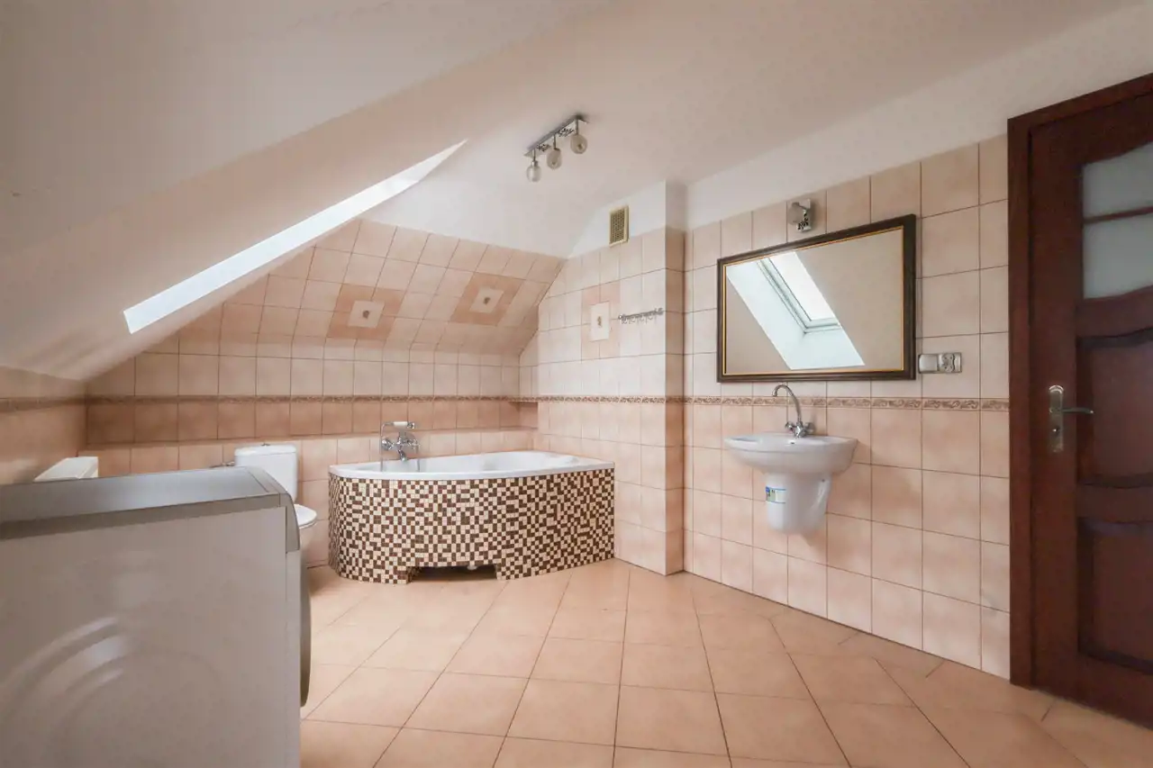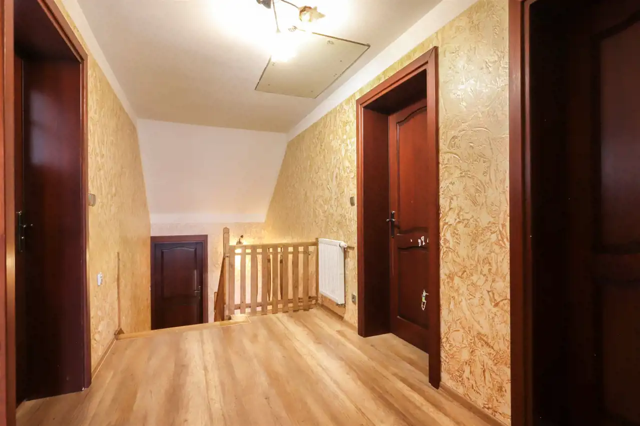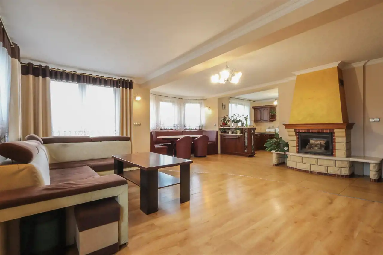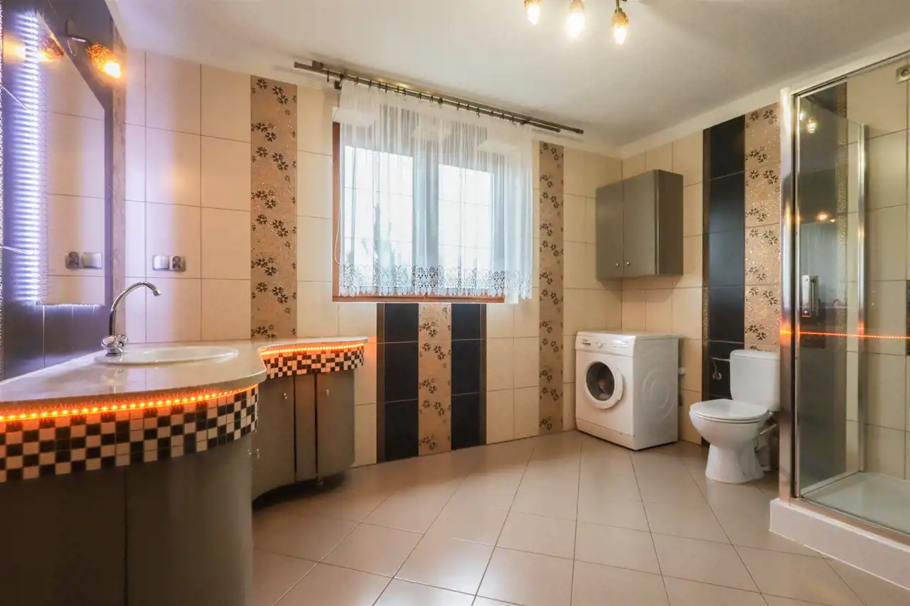 Dom o powierzchni 288 m² składa się z czterech przestronnych sypialni oraz dwóch nowoczesnych łazienek, co sprawia, że jest idealnym miejscem dla rodzin. Jego standard wykończenia oraz dobrze rozplanowane wnętrza zapewniają komfort codziennego życia. Dodatkowo, w piwnicy znajduje się sauna oraz stół bilardowy, które umilą czas spędzany w gronie rodziny i przyjaciół.