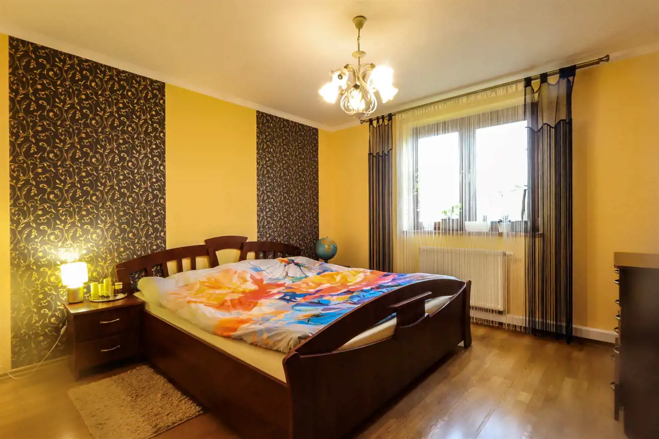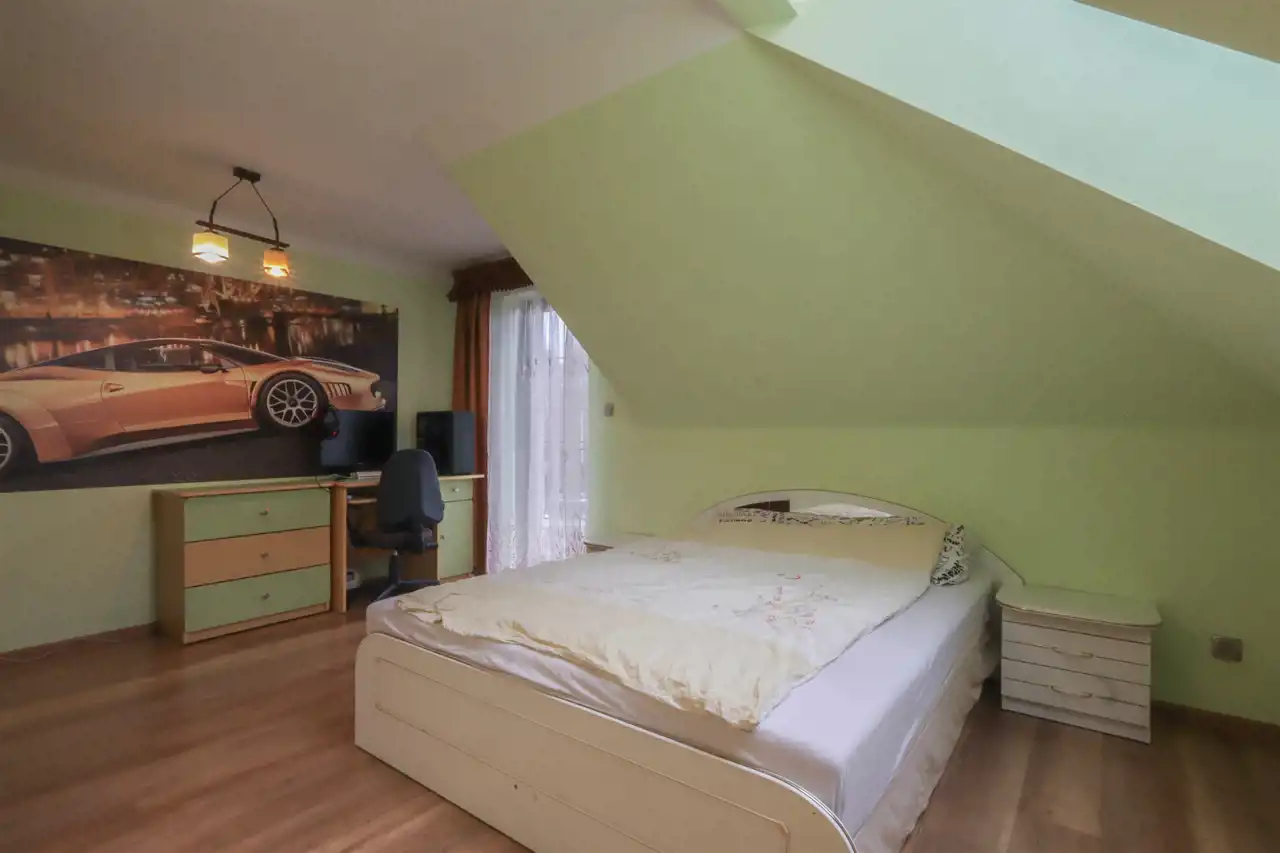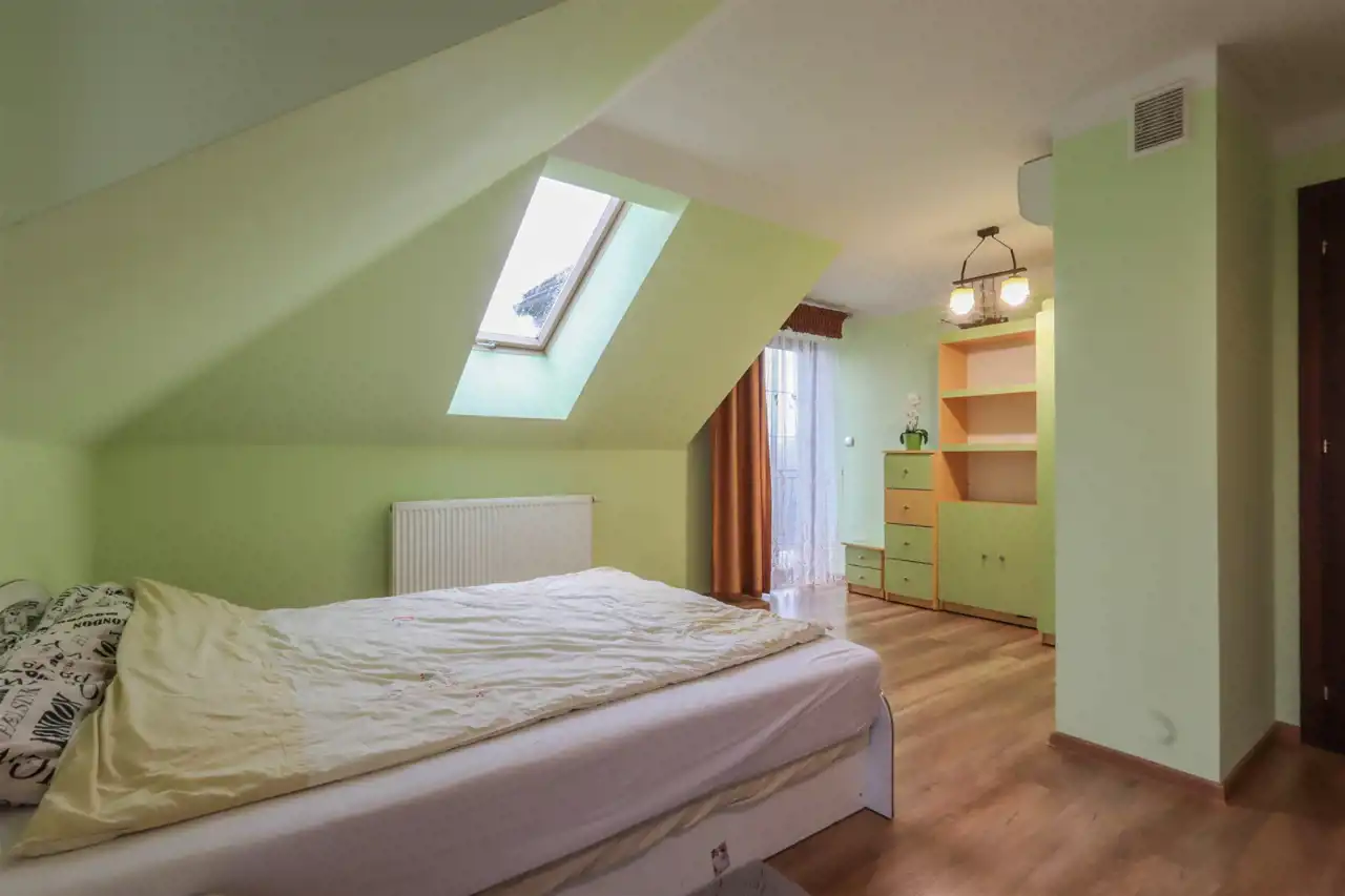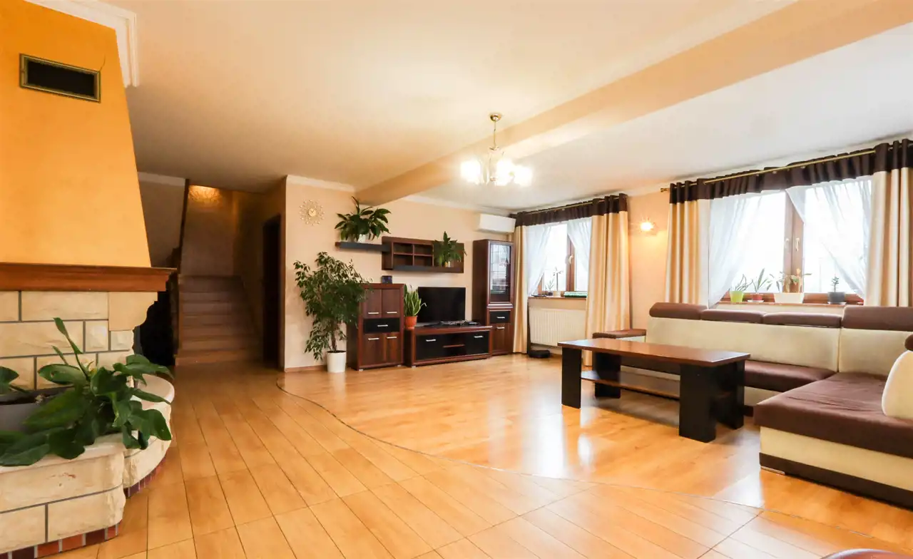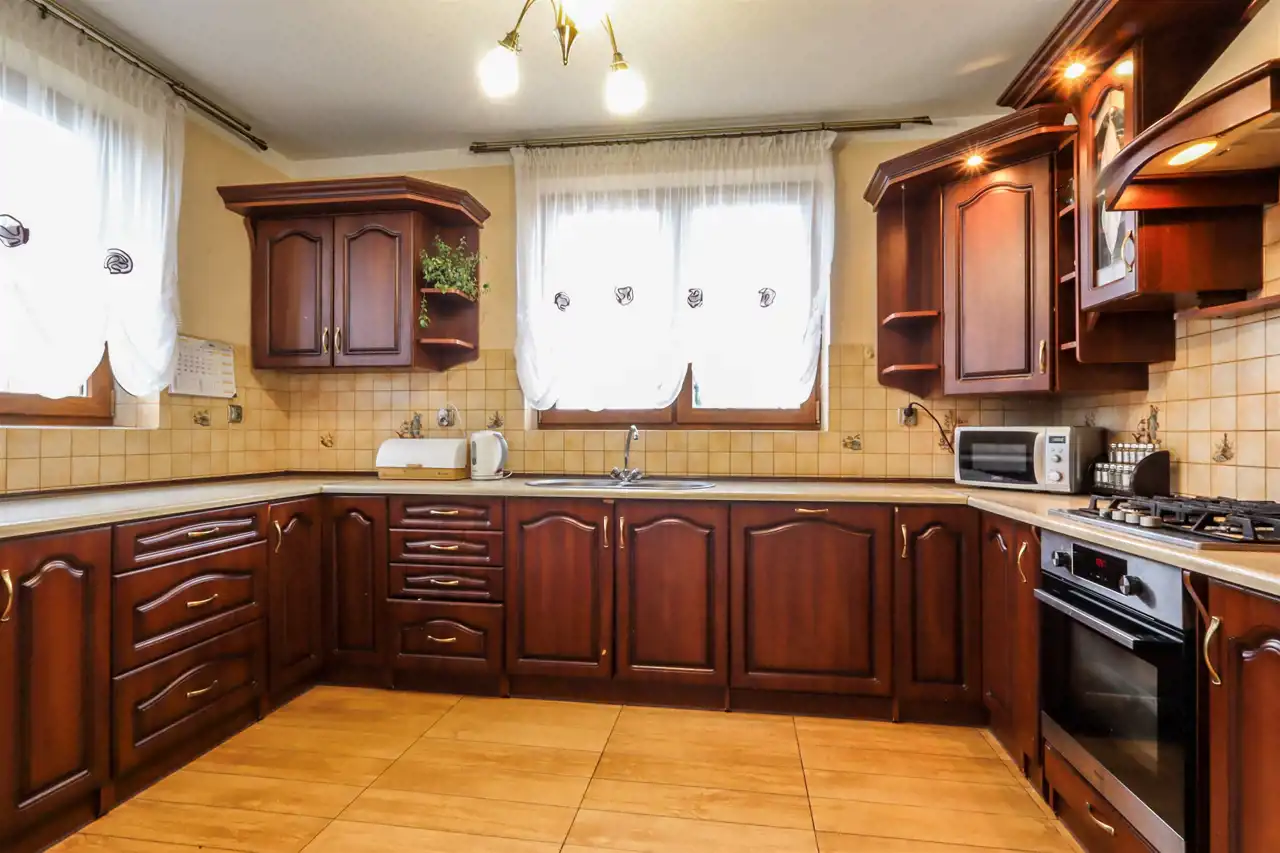 Dom o powierzchni 288 m² składa się z czterech przestronnych sypialni oraz dwóch nowoczesnych łazienek, co sprawia, że jest idealnym miejscem dla rodzin. Jego standard wykończenia oraz dobrze rozplanowane wnętrza zapewniają komfort codziennego życia. Dodatkowo, w piwnicy znajduje się sauna oraz stół bilardowy, które umilą czas spędzany w gronie rodziny i przyjaciół.