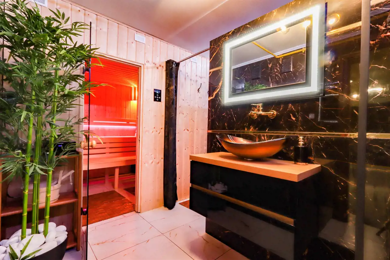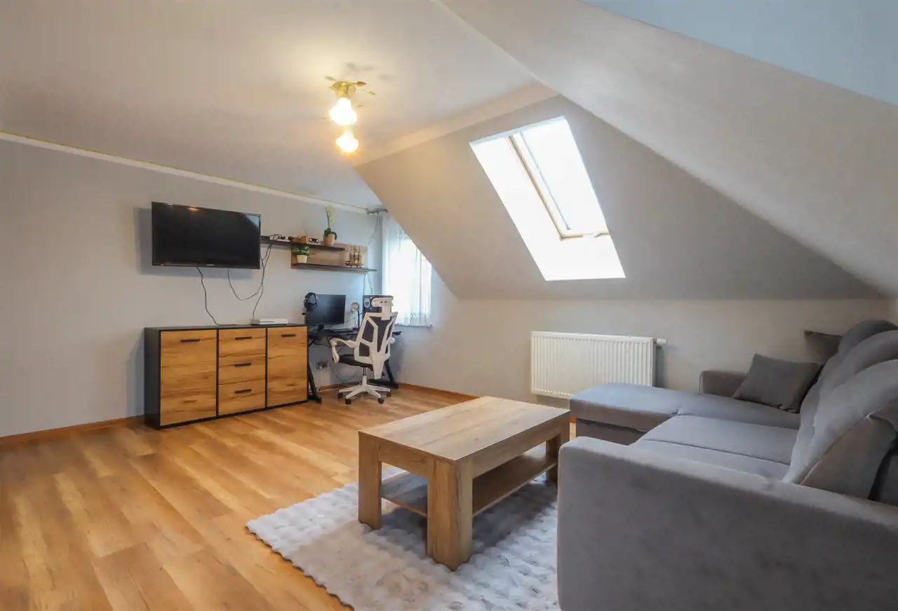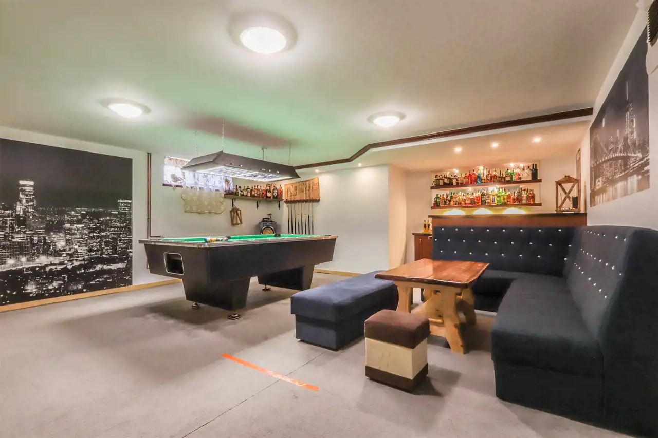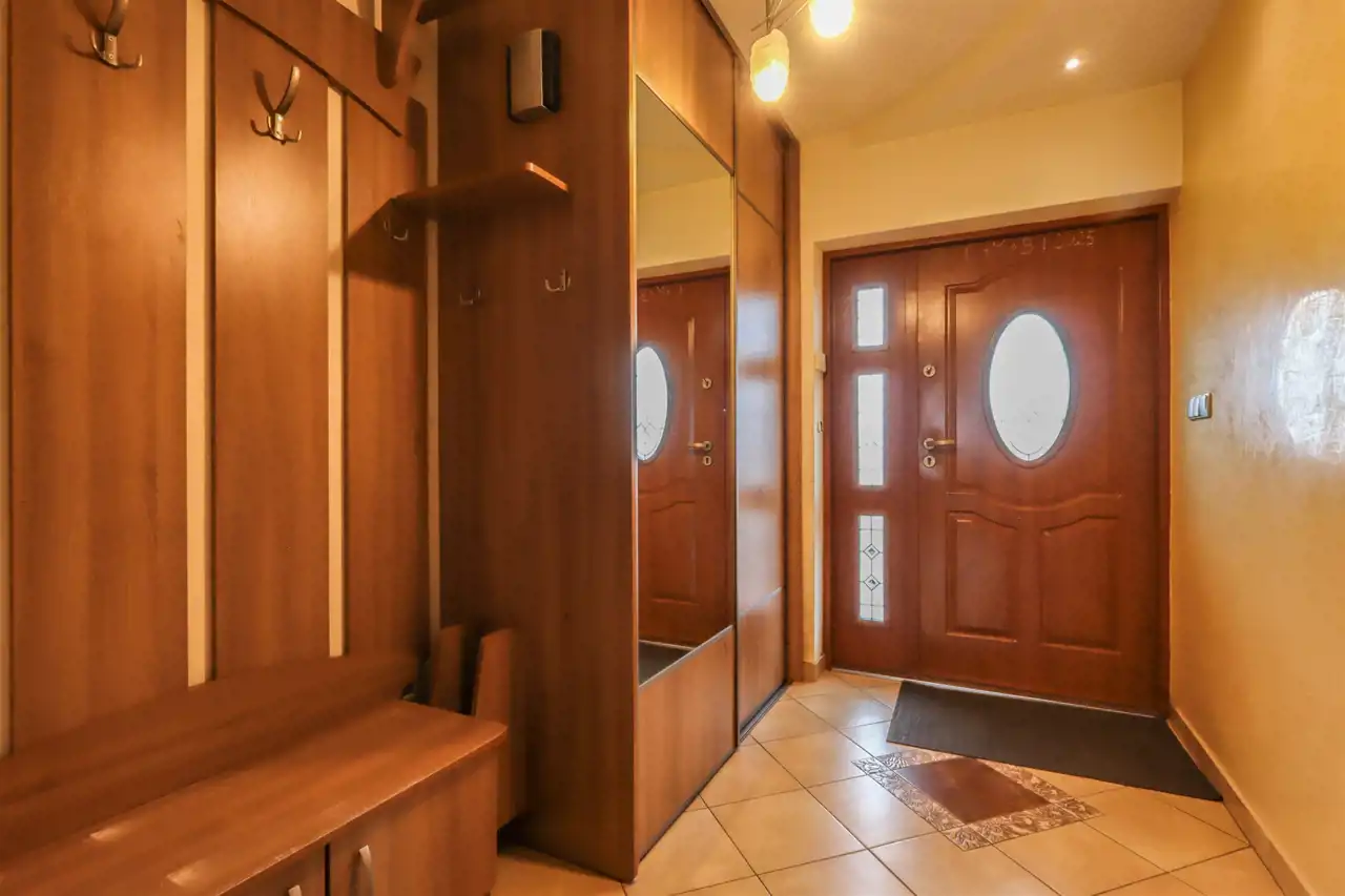 Dom o powierzchni 288 m² składa się z czterech przestronnych sypialni oraz dwóch nowoczesnych łazienek, co sprawia, że jest idealnym miejscem dla rodzin. Jego standard wykończenia oraz dobrze rozplanowane wnętrza zapewniają komfort codziennego życia. Dodatkowo, w piwnicy znajduje się sauna oraz stół bilardowy, które umilą czas spędzany w gronie rodziny i przyjaciół.