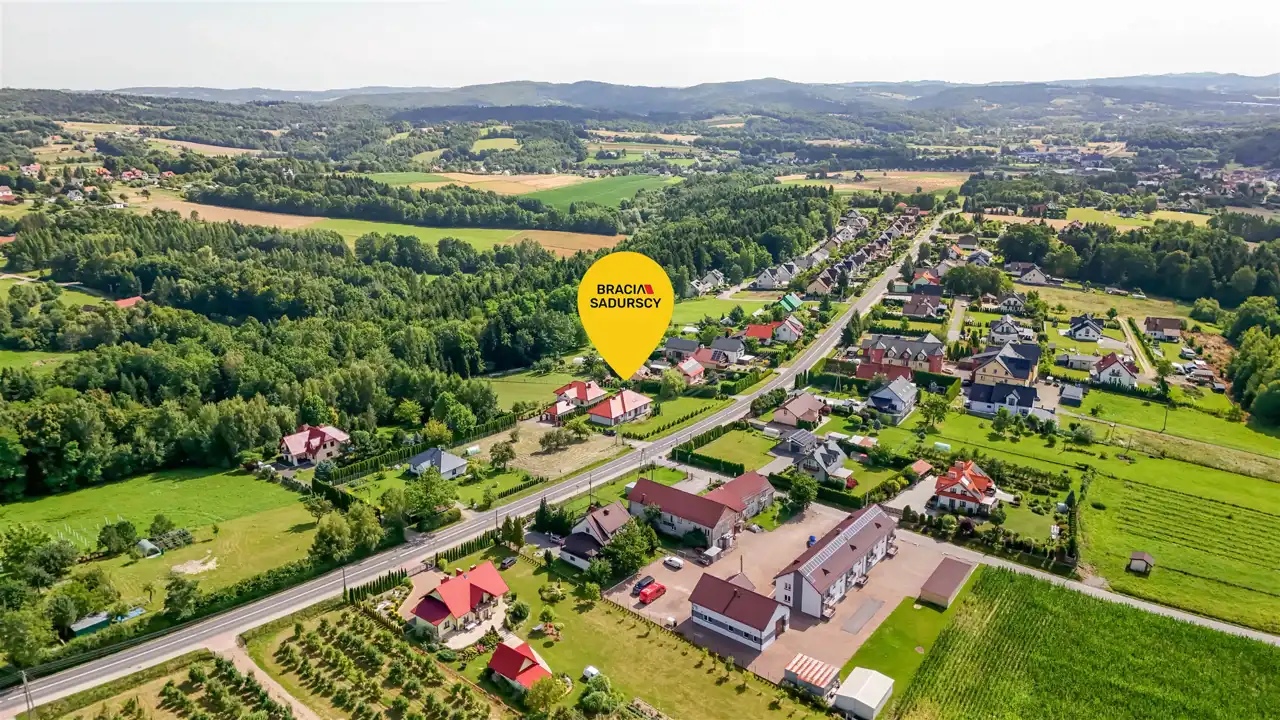 Działka o kształcie zbliżonym do prostokąta, nieogrodzona, położona przy drodze wojewódzkiej Wieliczka – Łapanów. Dojazd drogą utwardzoną wewnętrzną (udział w drodze). W sąsiedztwie zabudowa jednorodzinna.
