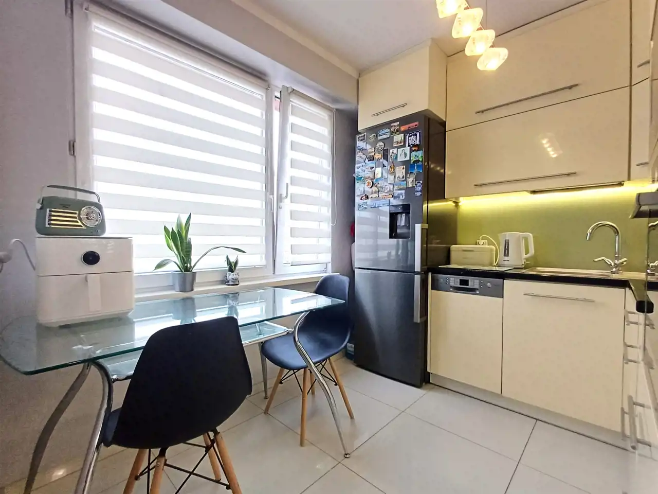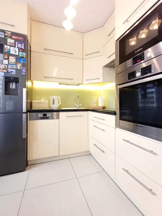 Kuchnia jest w pełni wyposażona – posiada płytę indukcyjną, lodówkę, zmywarkę oraz piekarnik. Zabudowa została wykonana w systemie Blum, co gwarantuje trwałość i komfort użytkowania. Mieszkanie jest po remoncie, zadbane i gotowe do wprowadzenia bez dodatkowych nakładów finansowych.