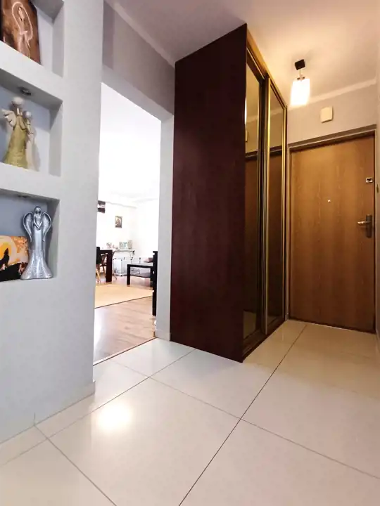 Sercem mieszkania jest jasny, przestronny salon o powierzchni 25 m² z wyjściem na duży balkon. Dzięki dużym oknom wnętrze jest bardzo dobrze doświetlone i daje poczucie przestrzeni. W korytarzu znajduje się pojemna szafa przesuwna, która zapewnia dużo miejsca do przechowywania.