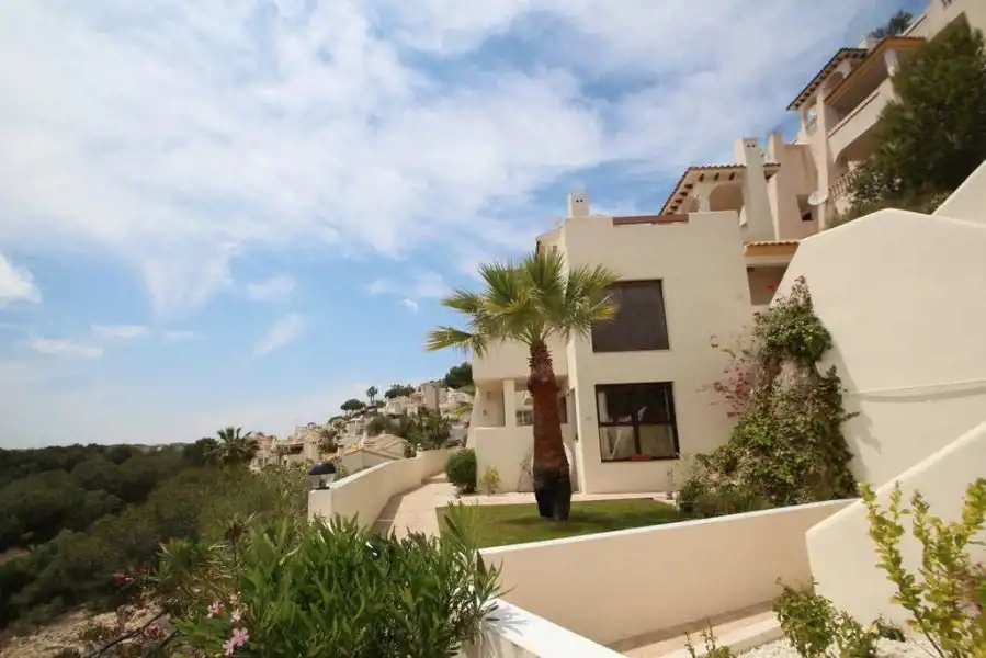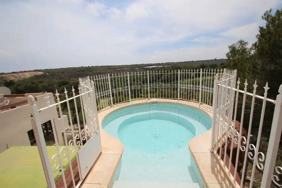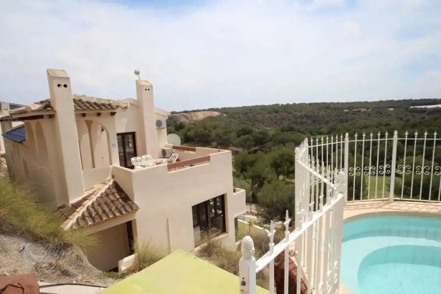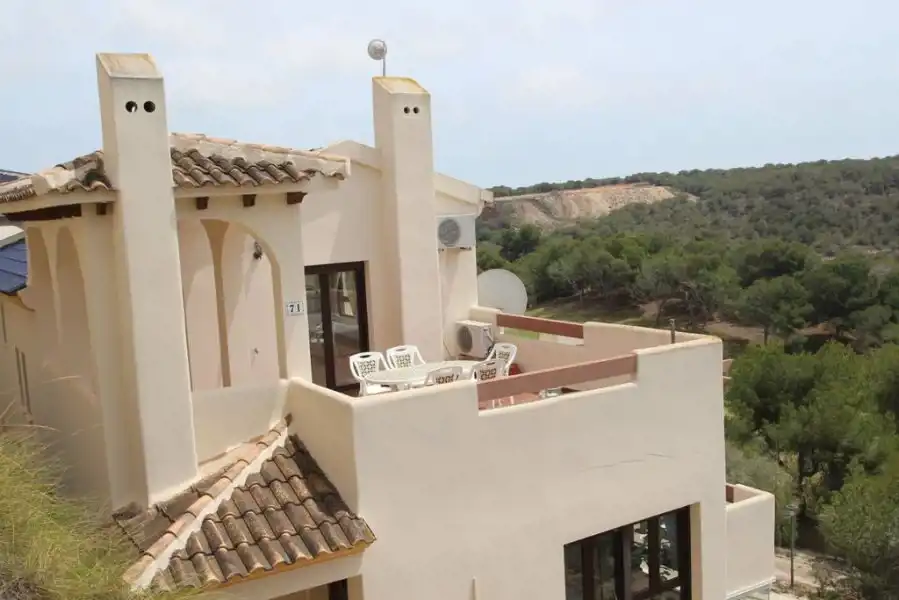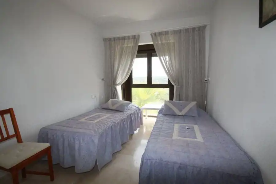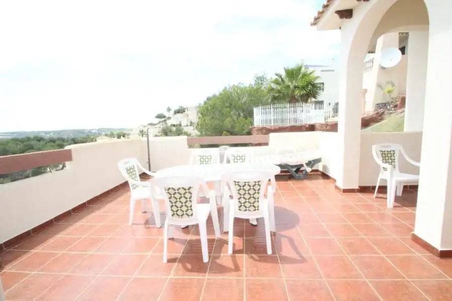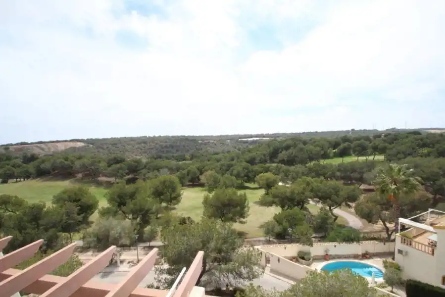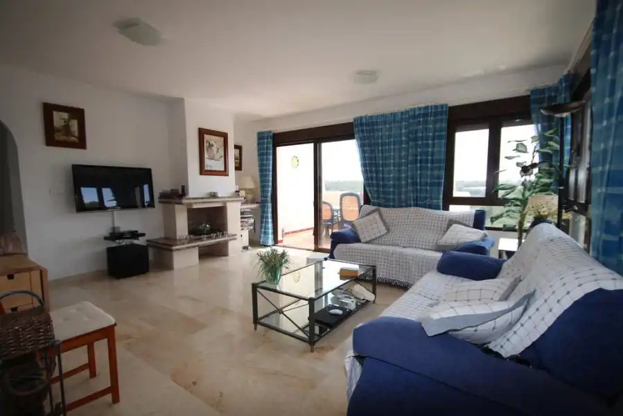 Urb. Las Ramblas, wonderful top floor apartment with views to the golf course and sea views, 130 mts, with 3 large bedrooms and 2 bathrooms, american kitchen with gallery, large living room with fireplace, large terrace of 8 mts and solarium of 30 mts, air conditioning, furnished, underground garage included, communal pool, south facing.